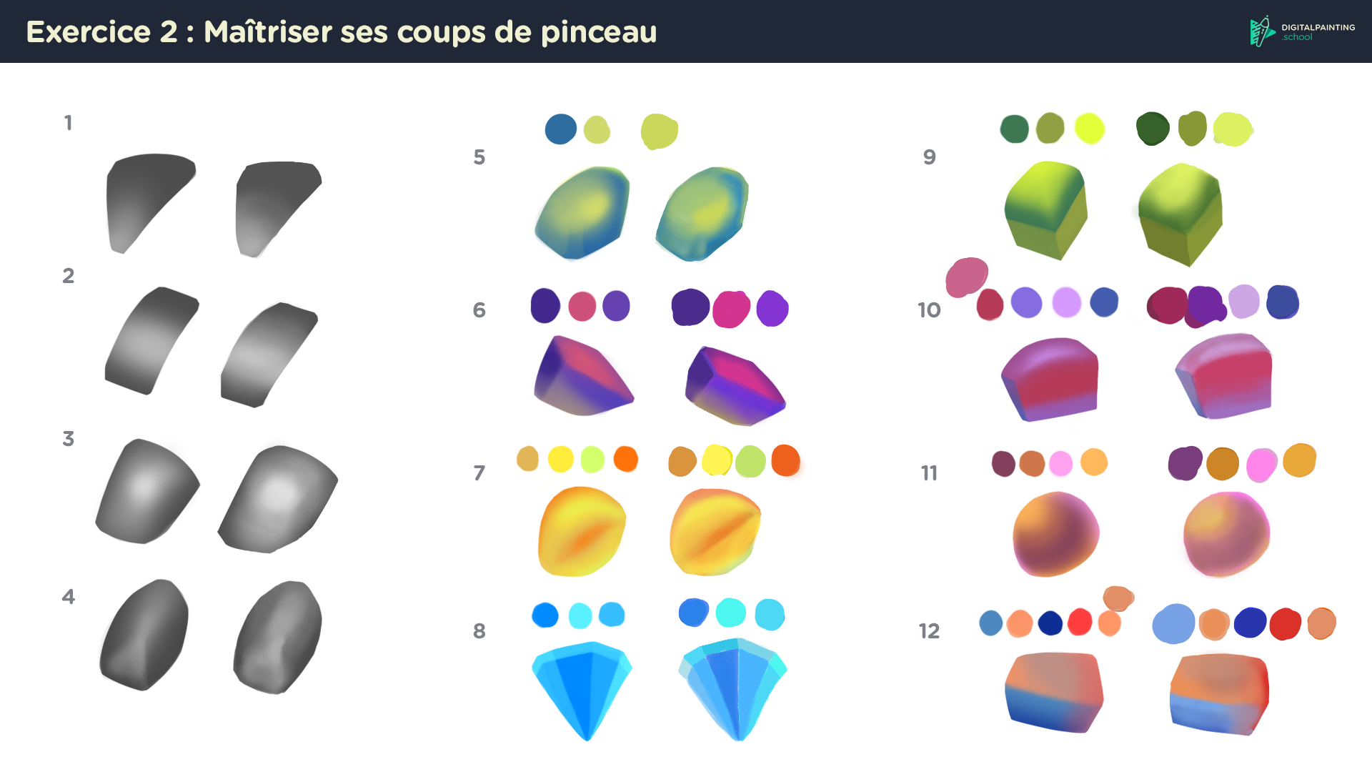 Salut @Diltiazen😉 Ok alors juste pour info, n'hésite pas à poster tes exercices au fur et à mesure plutôt que d'un seul coup, ça te permettra d'avoir des retours plus détaillés de tes exercices 🙂 Bon concernant l'exercice des formes, c'est un bon début mais ça reste un peu trop rought pour le moment 😉 je pense que tu pourrais affiner un peu plus tes bords par exemple et tes transitions au niveau des couleurs : comme sur celle-ci par exemple, on voit trop de coups de brush sur tes bords inférieurs, il faudrait les rendre moins visibles en utilisant une gomme dure, mais en essayant d'être un peu plus précis lorsque tu fais ton geste 😉 Au niveau de tes couleurs, là aussi je trouve que tes transitions sont un peu trop rapides et dures, peut être que ça vient d'un mauvais réglage de pression de ton stylet? n'hésite pas à regarder ça dans un premier temps, ça pourrait t'aider pour la suite celui-ci à était croqué 😜 Pour l'exercice 2.5 c'est bien, la base est là 👍 Après on pourrait continuer d'ajuster tes formes ou couleurs sur l'ensemble de l'image, mais à toi de voir si tu souhaites y passer un peu plus de temps dessus 🙂 Pour la rose, il faudrait clean un peu plus ton rendu, en enlevant la line par exemple, et en diminuant les effets flous : comme ici par exemple, c'est un peu trop brouillon avec ces coups de brush soft, ensuite ça manque de volume, donc n'hesite pas à assombrir davantage tes ombres pour ça 🙂 Et pour la montagne, la base de la technique est là, c'est bien 👍 Il faudrait juste revoir certaines parties pour pousser un poil plus le résultat : par exemple ici on ne devrait pas voir la partie noire derrière 🙂 Sur la montagne, même chose avec la partie de gauche, normalement elle devrait être davantage cachée par la brume ^^ Voilà mais bon déjà commence par ajuster ces différents points et on verra pour la suite ! Allez continues comme ça c'est bien ✌️