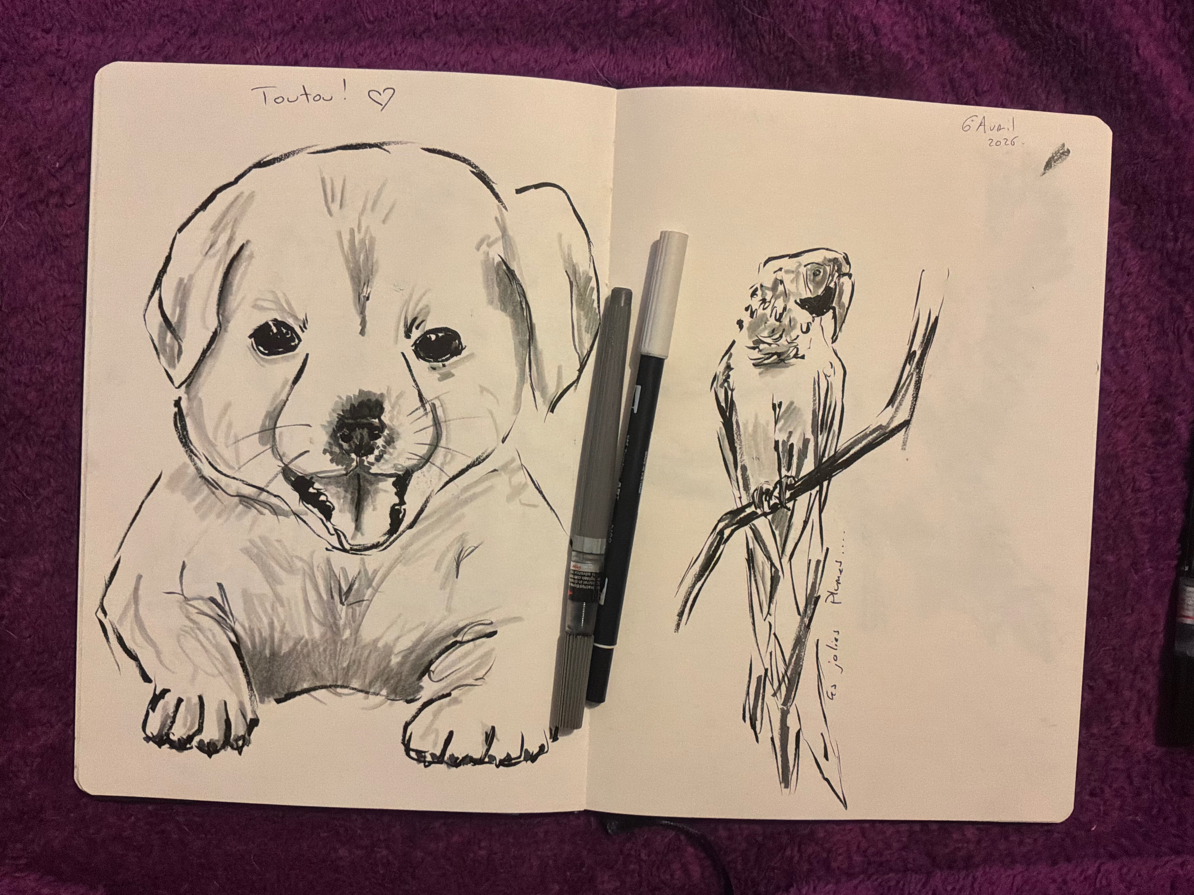 Toujours des zanimaiux à 5 min de poses et j’ai eu du toutou, du oizo et un coin coin aujourd’hui. J’ai mal placé ses pattes le pauvre loulou -
