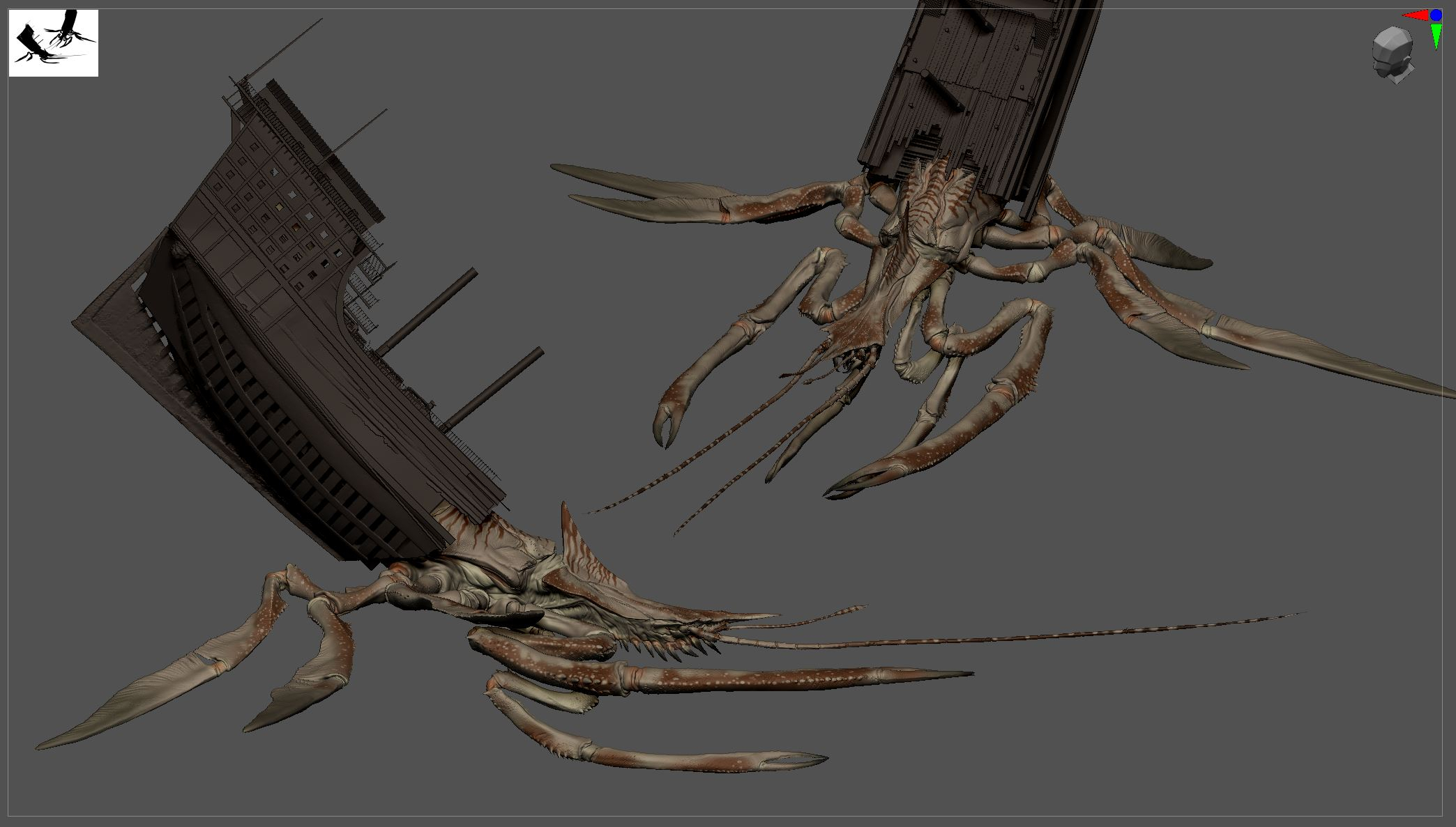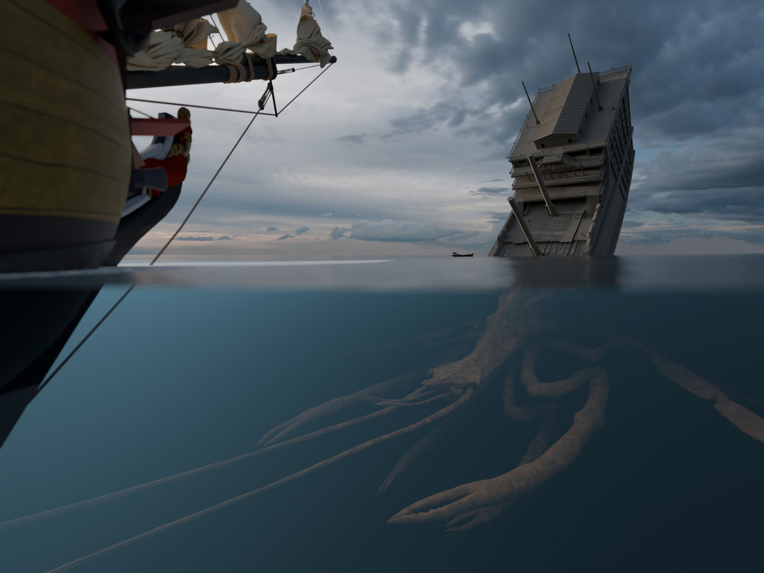 @Bastien CH Je t'avoue que j'aime bien ce coté étrange du navire coulé au milieu de l'océan, je veux pas qu'on se disent que le kraken utilise le navire comme un appat, mais vraiment comme une protection. De mon coté j'ai surtout avancé sur le sculpt de la créature et un peu avancé sur la scène blender même si beaucoup de chose risque de bouger avec la pose du kraken. Encore un peu de boulot sur le bateau (casser le coté très carré de la 3d, casser plus de truc), ajouter pas mal de corde) mais surtout rajouter des éléments sous la surface (poisson, requin, débris) et des petit bonhomme pour donner l'impression d'échelle. J'espère avoir une bonne base pour faire du paintover