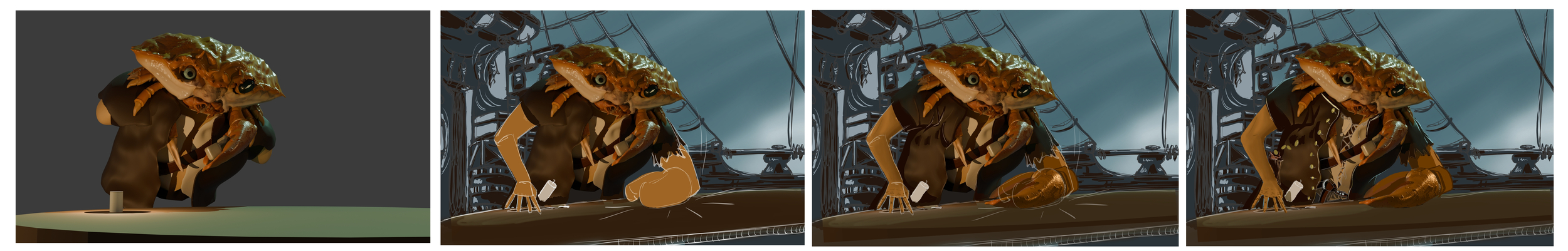 J'ajoute progressivement du détail sur les vêtements pour y voir plus clair, avec la chemise intérieure, les ceintures et le manteau. Je teste l'ajout d'une poche avec une bourse dont le contenu s'envole pour garder l'idée du mouvement, que je renforcerai avec la bougie je pense.