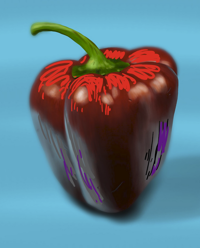 Hello @clemence_m ! Pas mal du tout pour le poivron ! Effectivement tu peux utiliser des philtres, mais le brush floue marche tout autant, après ça demande pas le même travail c'est sûr. Juste je pense en revanche qu'on peut venir éclaircir le haut des poivrons, tout en restant assez saturé en rouge. Et peut être que les reflets en bas mériterait un peut plus de douceur dans leur transition. Celui à droite est peut être un poil trop clair, ne pas hésiter à l'assombrir avec un bleu un peut plus coloré. Je t'invites à rechecker la ref le plus régulièrement possible (si possible, essayer de travailler avec la ref sur le même fichier) Bon courage ! -