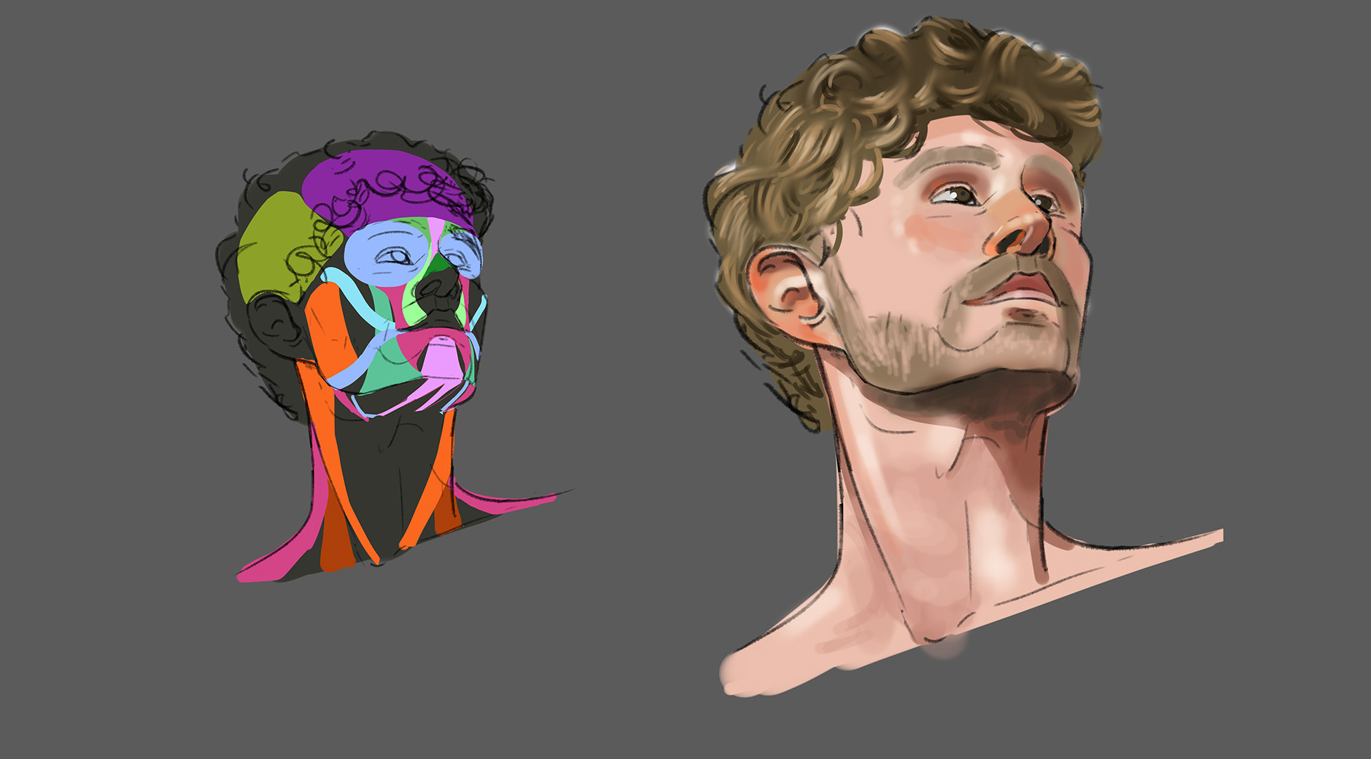 Hello à tous, voilà un premier visage, qui ne ressemble pas trop à la ref, l'angle de vue est pas évident 😅 et j'ai essayé de repérer les différents muscle du visage mais pas sûr que ce soit très précis haha. -