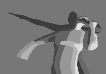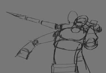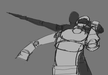 Bon passons au dynamisme ! Objectif : scène d'action, poses dynamiques. fond secondaire Des petits mannequins pour éviter de foirer l'image à l'étape 0 à cause de l'anatomie ! Silhouettage grossier non définitif Test des valeurs globales (hors valeurs locales, juste pour poser la lumière) -