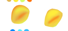 Salut @TheVolk😉 ok ça marche bien pour un début 👍 Au niveau des formes on voit que ça manque de précision, mais c'est tout à fait normal : comme ici par exemple ^^ Notamment au niveau de tes bords, les découpes sont un peu trop nettes, pour ça il ne faut pas hésiter à tourner ton document et utiliser la gomme pour venir sculpter les parties trop pointues avec un brush rond dur ^^ 🙂 Sinon pour tes couleurs, c'est pas mal, tes transitions sont chouettes dans l'ensemble 👍 Après il y a aussi des zones à ajuster : comme ici au centre de ta forme, tu pourrais adoucir la transition sur les côtés par exemple en élargissant un peu la couleur plus orangée, juste avec un brush plus soft ^^ sur la dernière, on retrouve un peu ce même souci, la couleur rouge pourrait être un poil plus étendue vers la gauche de façon progressive Et la zone plus sombre sur la partie bleue, pourrait être un peu moins claire et tu pourrais là aussi revoir la transition vers le haut ^^ Voilà mais sinon c'est bien, continues comme ça ✌️