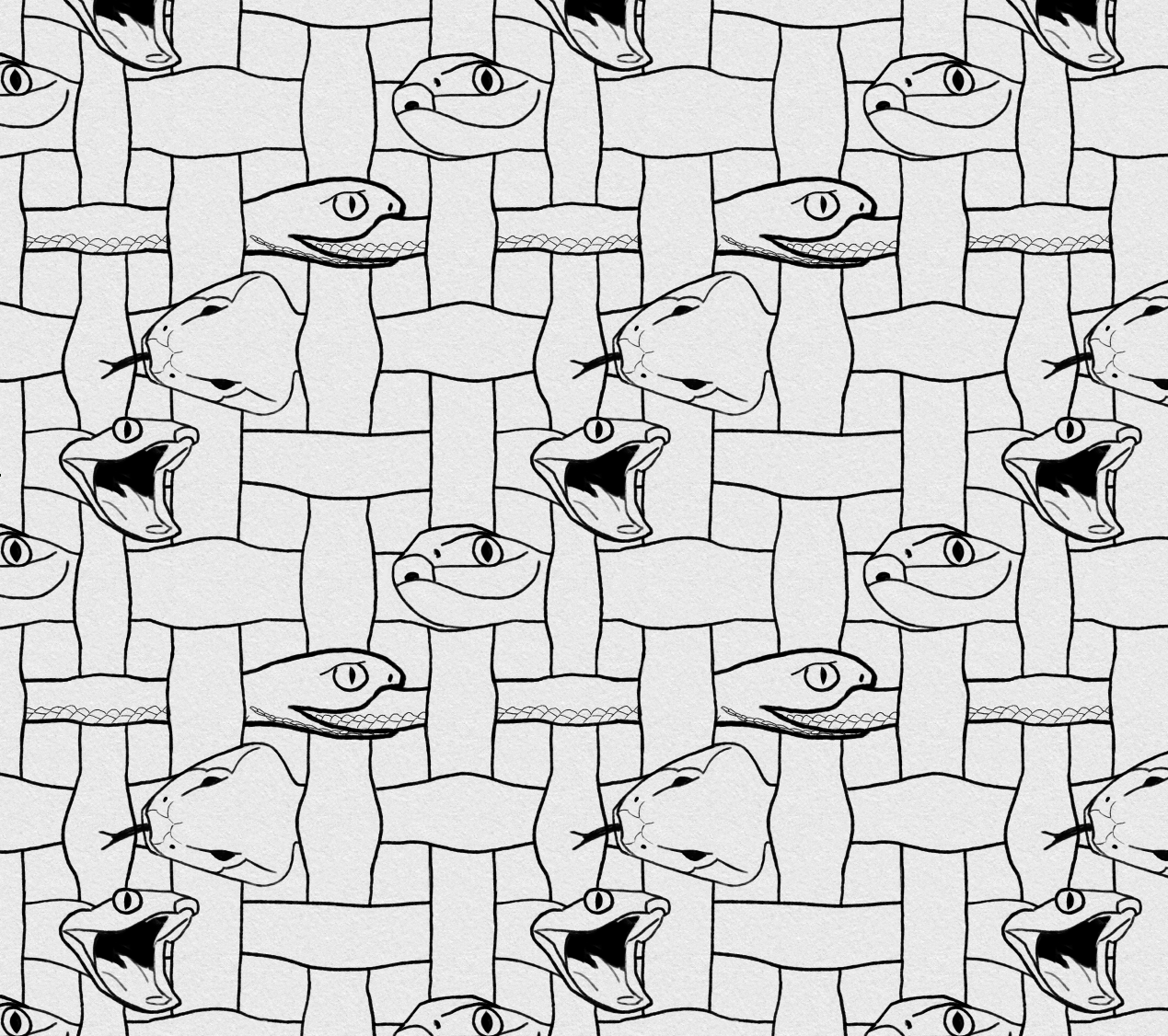 @Julie L Superbe ! Quelle courage de se lancer dans un portrait : visage et mains sont superbes 🙂 @Caro Vespera Ayaya ! Un chouilla trop réaliste à mon goût cette bestiole là... mais très réussie ! @yurinomai C'est de plus en plus craquant ! Tes petites souris sont pleines de vie @Diamones Superbe ! Ton premier dessin a eu du succès auprès de mes loupiots : nul doute que celui ci en aura également ! @iselderblaick Ton perso est génial : elle a un air tout à fait machiavélique ! Pour ma part j'ai (déjà !) commencé à prendre du retard alors je poste mon jour deux en cours pour me lancer dans le suivant. Soyons optimistes : j'aurais peut être le temps de le terminer ce week end 😉 Bref : mon thème du jour 2, c'est le tissage de serpents ! J'aime beaucoup le travail d'Escher sur le pavage, alors je me suis lancée dans un tissage qui pouvait se répéter indéfiniment. Les têtes des serpents verticaux sont terminées mais il me reste celles des serpents verticaux et peut être quelques détails. alors je me suis lancée dans un dessin "infini"