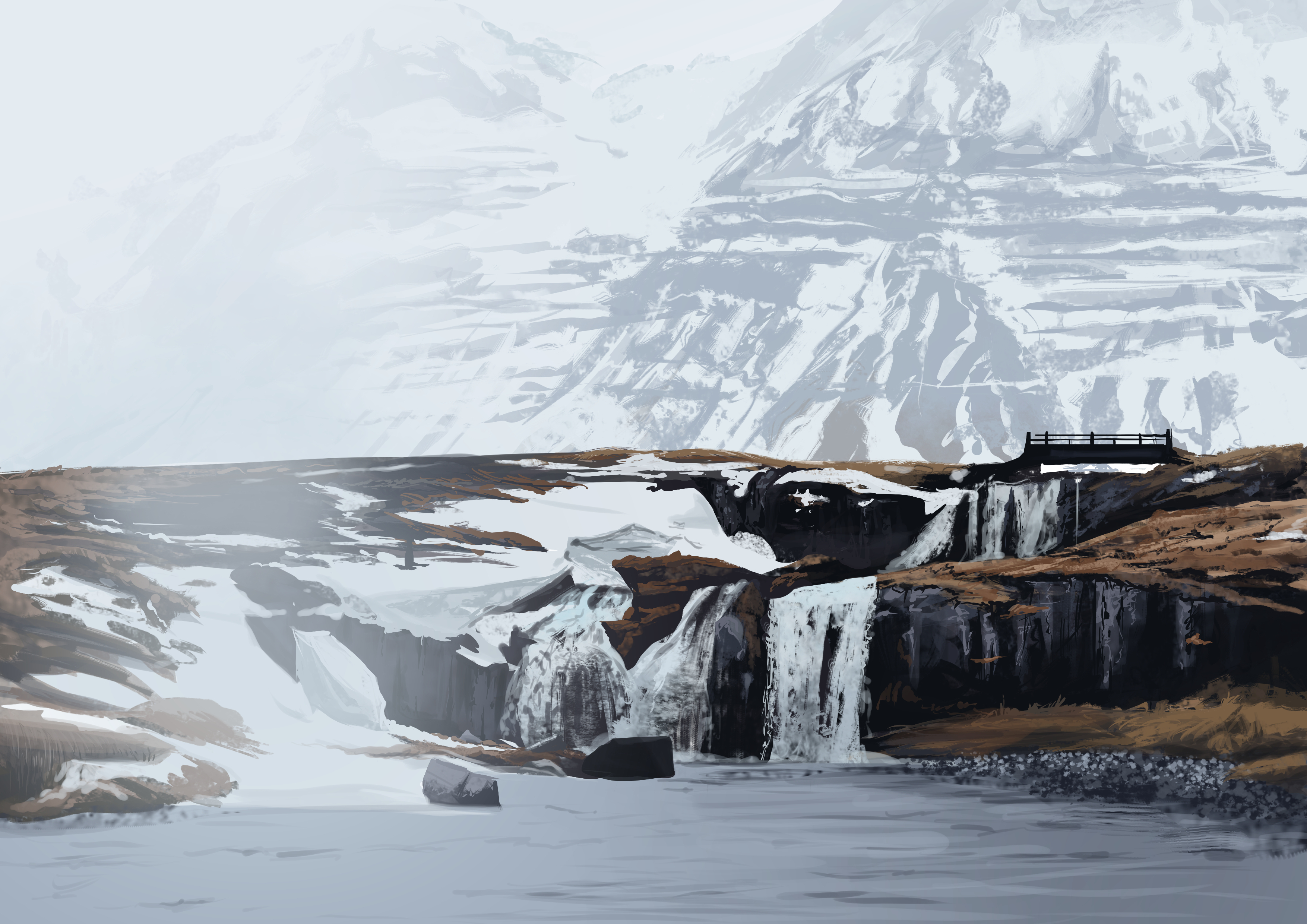 13. Vraiment pas inspiré non plus aujourd'hui, après quelques hésitations, un truc que je pensais faire hier en supplément : une petite vignette pour ma version perso d'Excalibur (cours "Blender pour le concept artist"), ça ne se voit pas comme ça, mais le truc qui contient le cube lumineux est un engin spatial qui se serait ecrasé dans une montagne, ou un volcan, percée de quelques cavernes. J'imagine des débris un peu partout, dont un pan entier de la coque à gauche, d'autres plus petits un peu partout, abîmé par le temps et couverts de végétaux divers. Les trucs verticaux sont censés être des tuyaux pour faire plus "engin spatial". Je vais surement travailler un peu tout ça dans les prochains jours, j'avance en plus dans le cours en même temps comme ça :).