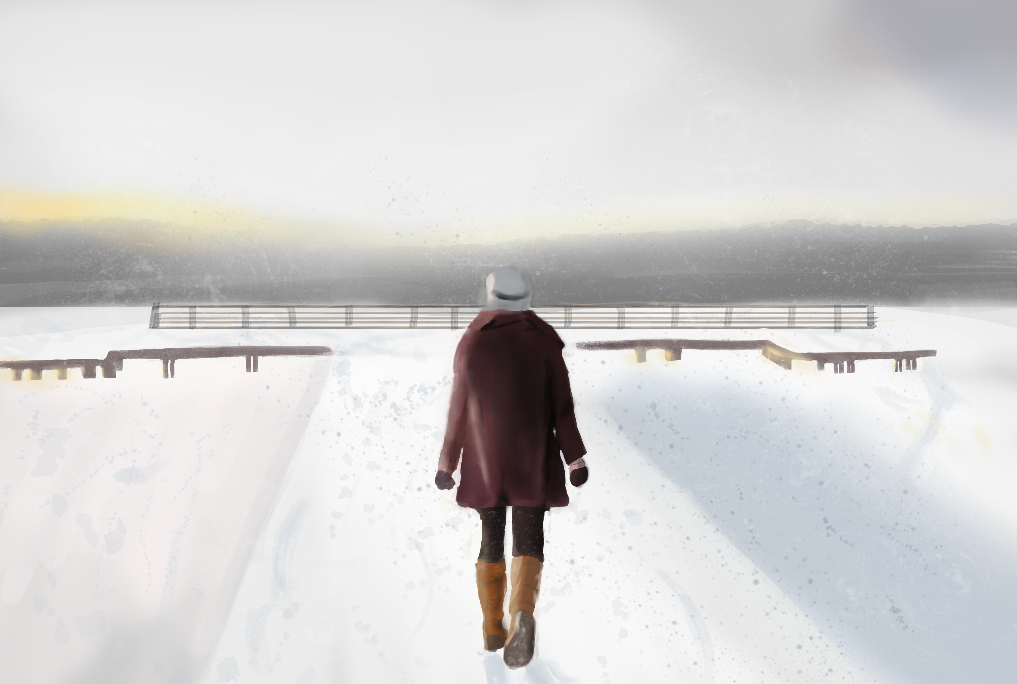 Suite du travail de la scène avec le travail des couleurs, de la lumière et de l'ambiance. J'ai essayé de garder une ambiance froide malgré la dominance de la lumière sous-entendued'une torche. J'ai plus détaillé le ciel pluvieux en arrière plan. -