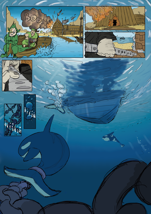 Salut ! Pour ma première participation à un challenge, je tente de faire une mini BD (Les BD c'est mon truc) de 4 pages où chaque planche raconte une mini histoire pouvant être lue indépendamment des autres. La page 1 représente une scène d'attaque des Orques d'Almar sur Ned et GroPoings. Voici mes croquis :