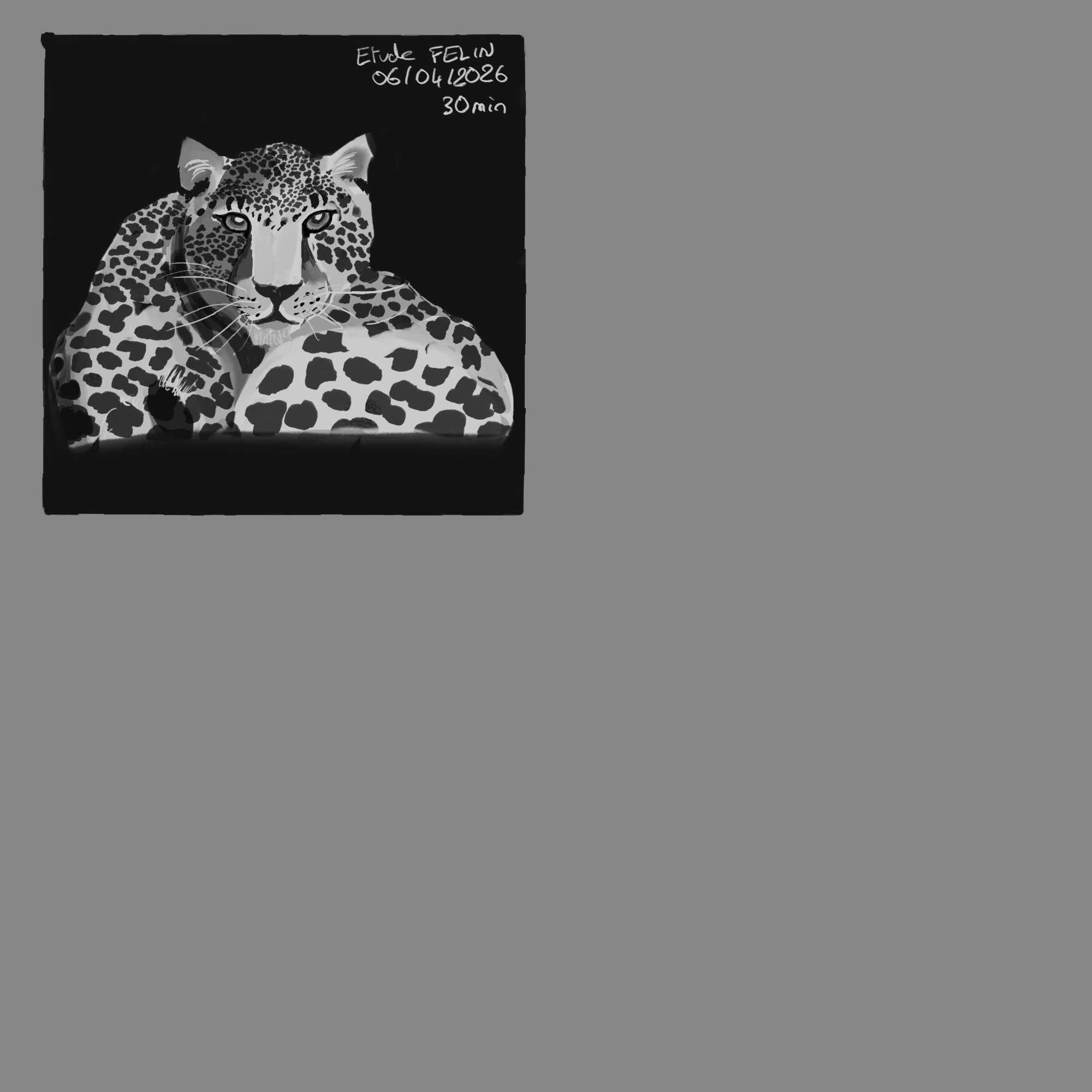 Bonjour, voici l étude de félin de ce jour. Je me suis créée un brush pour le pelage et j’apprends à l ‘utiliser cela me permet d aller plus vite. je suis toujours à 30 min car en 15 je ne fais pas grand chose! bon lundi de Pâques à tous! -