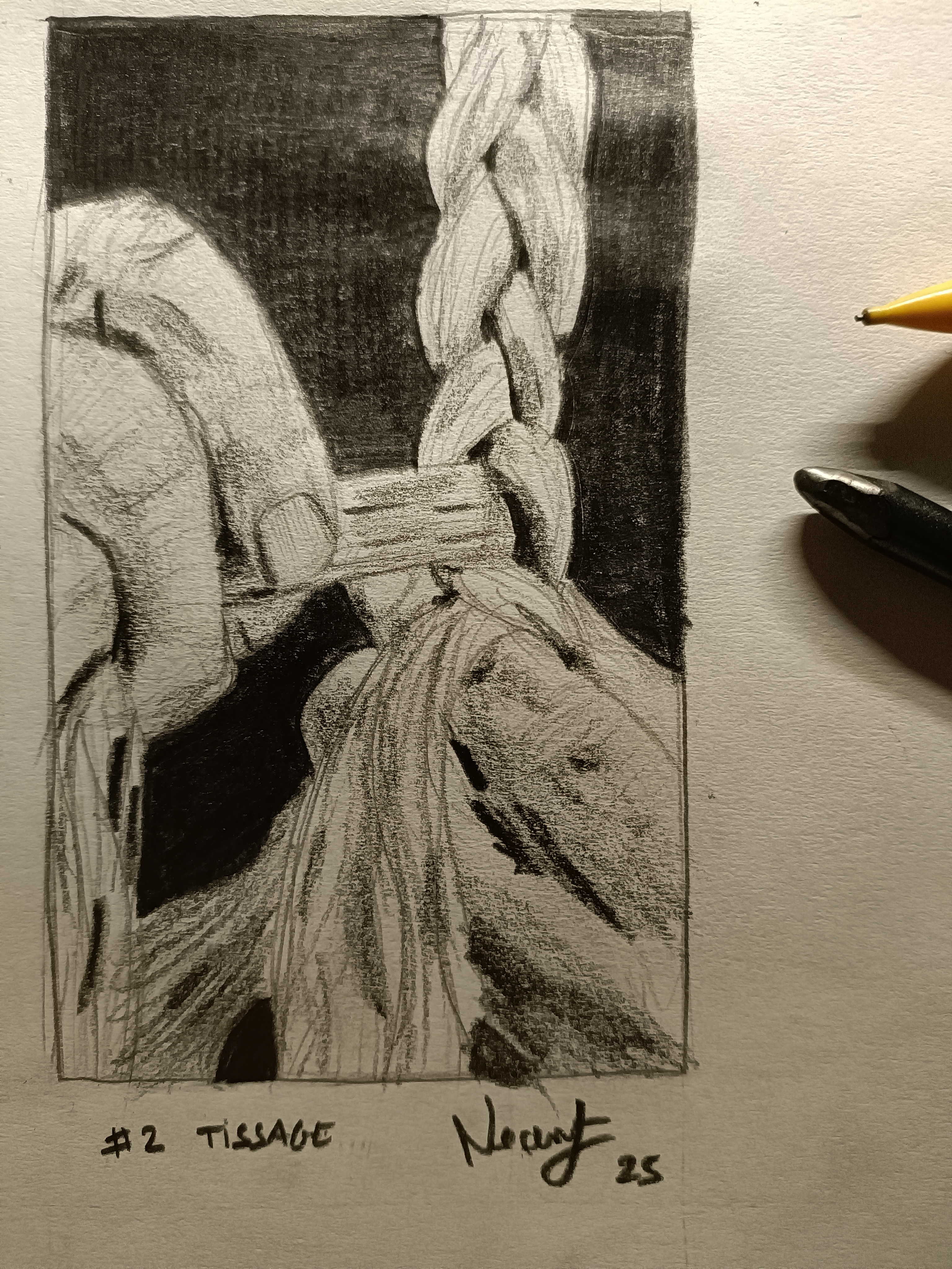 4. Salut tout le monde. Pour être honnête, ce tissage ne m'a pas beaucoup inspiré. Résultat, je me suis contenter de quelques bandelettes tissées justement. Ça m'a permis de travailler en valeur. Le problème quand on poste tardivement, c'est qu'on a plein de super propositions à commenter. allez je me lance : @ApostroKe Toujours aussi flippant @daffsympa la compo @poltu le regard de cette tisserande est intimidant @fred21 simple, efficace @stefouj'aime vraiment ton univers @Fl0ck0n oui pas foufou le thème @Orel top les mains @juliaBlanchard les drapés et la lumières sont top @Deny l'arc, les flèches... pas de doute, Pénélope attend Ulysse. @1 neasbien la pose du perso @pamin églantine ? @June j'aime beaucoup les mains squelettiques @oknim7 cheveux et tatouage au top ! @arky_ la main est vraiment bien et les fils orange apporte la touche couleur qu’il faut ! @holdwigtrop choupi ! @Haeresis Les parques sont réussie. La main et la jambe droite de celle du milieu me semblent un peu grande @Shelter j'aime beaucoup l'ambiance @yurinomai Toujours fan @Ninipumpkin le choix de la couleur est top @etiennazela pose est super dynamique ! @Lodorca me fait penser à la Roue du Temps @Gopperus sympa cette araignée pelote de laine @PandorArtC'est mon cerveau en voyant le thème du jour @iselderblaicksuper compo de cette Shiva tisserande