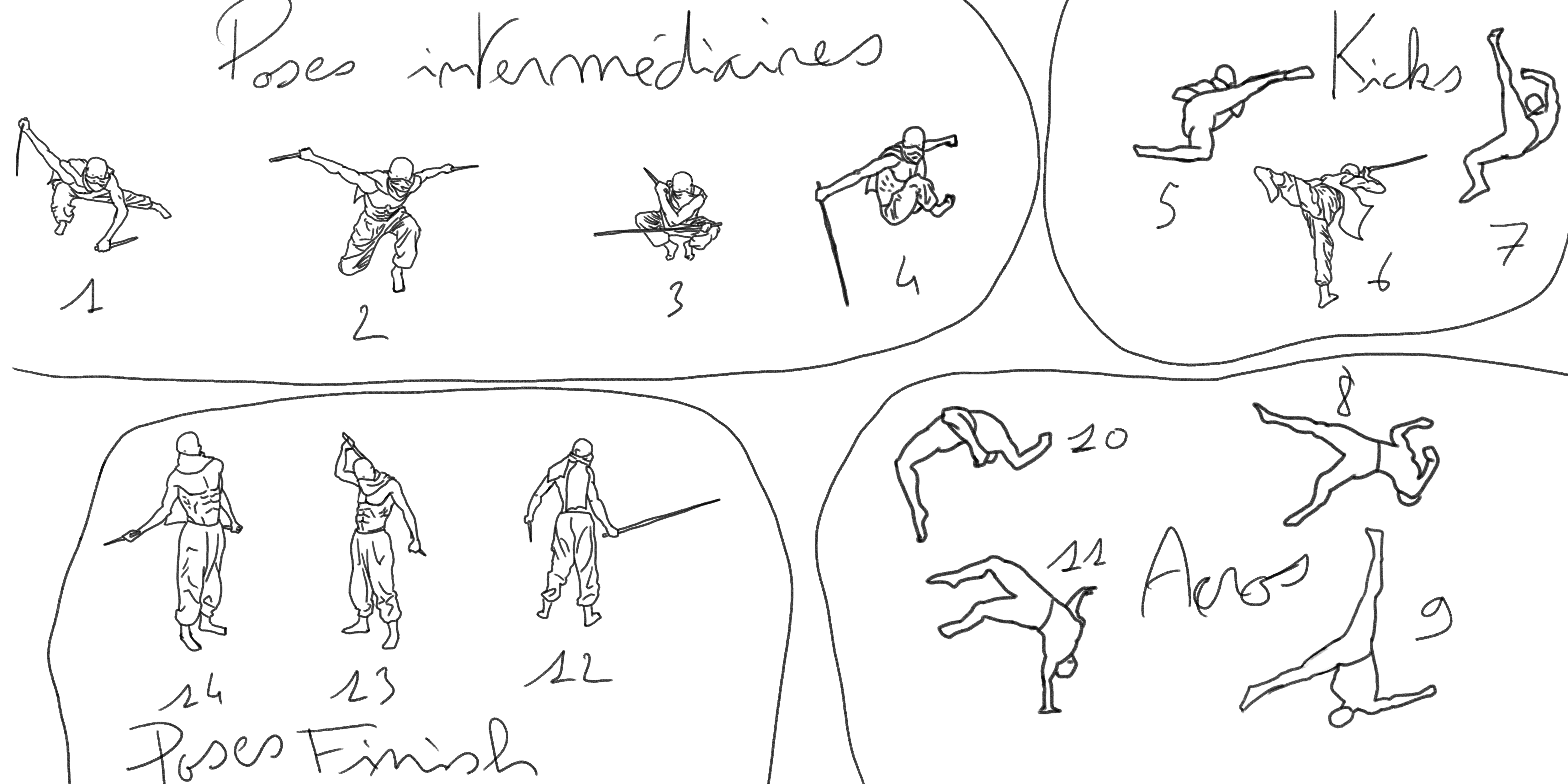 C'est parti pour les recherches de poses !! Je pense vraiment essayer de faire figurer plusieurs poses sur une même illu, pour montrer le "chemin" emprunté par Hayabusa dans une bataille à 1 contre 5 ou 6. Pour ce faire, je me suis éclaté à me prendre pour modèle dans les poses les plus badass que je pouvais imaginer, torse nu avec une écharpe et un pantalon bouffant rentré dans les chaussettes 🤣 Donc toutes les poses avec le pantalon détaillé c'est bibi ! (oui, avec quelques muscles en plus 😁) J'ai aussi pris des réf de tricking : acrobaties mélangeant coups de pieds de divers arts martiaux, ainsi que figures de breakdance, capoeira et gymnastique. À partir de certaines poses parmi celles présentées ci-dessous, je vais donc tenter de créer une composition dynamique tout en évitant un effet fouillis qui sera dangereusement proche à chaque instant... Des avis sur les meilleures poses de chaque catégorie ? 😄