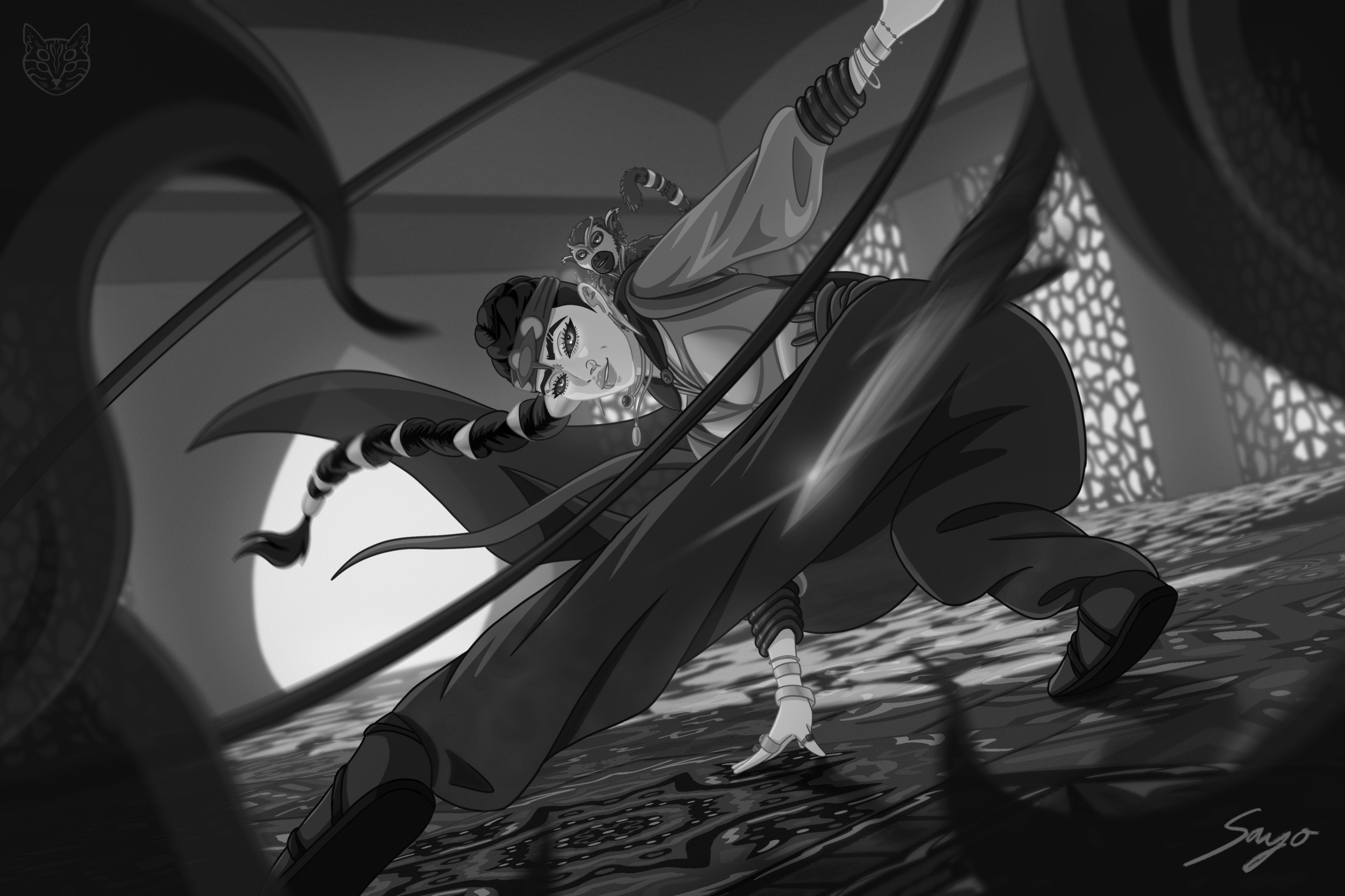 Salut @vinceinstudio Merci beaucoup pour ton commentaire. Je débute également donc le style vient un peu par hasard je dirait mais pour te répondre, mon process s'est fait comme ça : - j'ai peint en valeur de gris - perso et détails + grille pour la composition (un peu tard !) - couleurs et ombres (j'ai fait quelques tests de palette comme tu peux le voir) - j'ai ajouté le feuillage parce que sinon il y avait des grandes zones de noir pas très belles, donc un peu par hasard ahah Merci beaucoup pour les remarques sur les ombres et le feuillage. Maintenant que tu l'as dit je le vois bien ! bon dessin sur DPS ! -