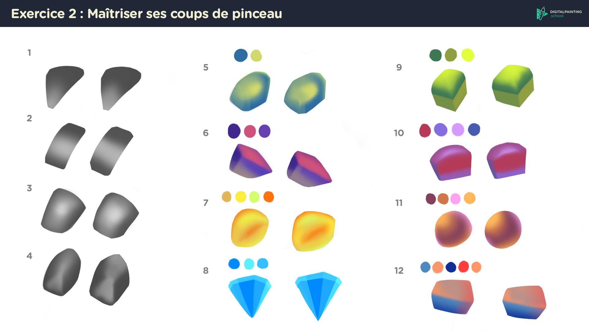 Coucou, Oui prend ton temps, le but sur ce chapitre c'est vraiment d'arriver à prendre en main les outils et faire des blendings corrects. Je trouve que tu t'en sors assez bien même si les formes diffèrent un peu. on devrait avoir un dégradé plus doux ici, plus d'ombre ici et une forme moins large, ici essaies de conserver le bord de droite (transition ombre et lumière) un peu plus net. Et pour celui ci le blending n'est pas assez prononcé (c'est encore un peu trop net) Tout est une question de dosage et de pression du stylet, n'hésites pas à changer la sensibilité de la tablette d'ailleurs si tu trouves que c'est trop doux ou trop ferme.