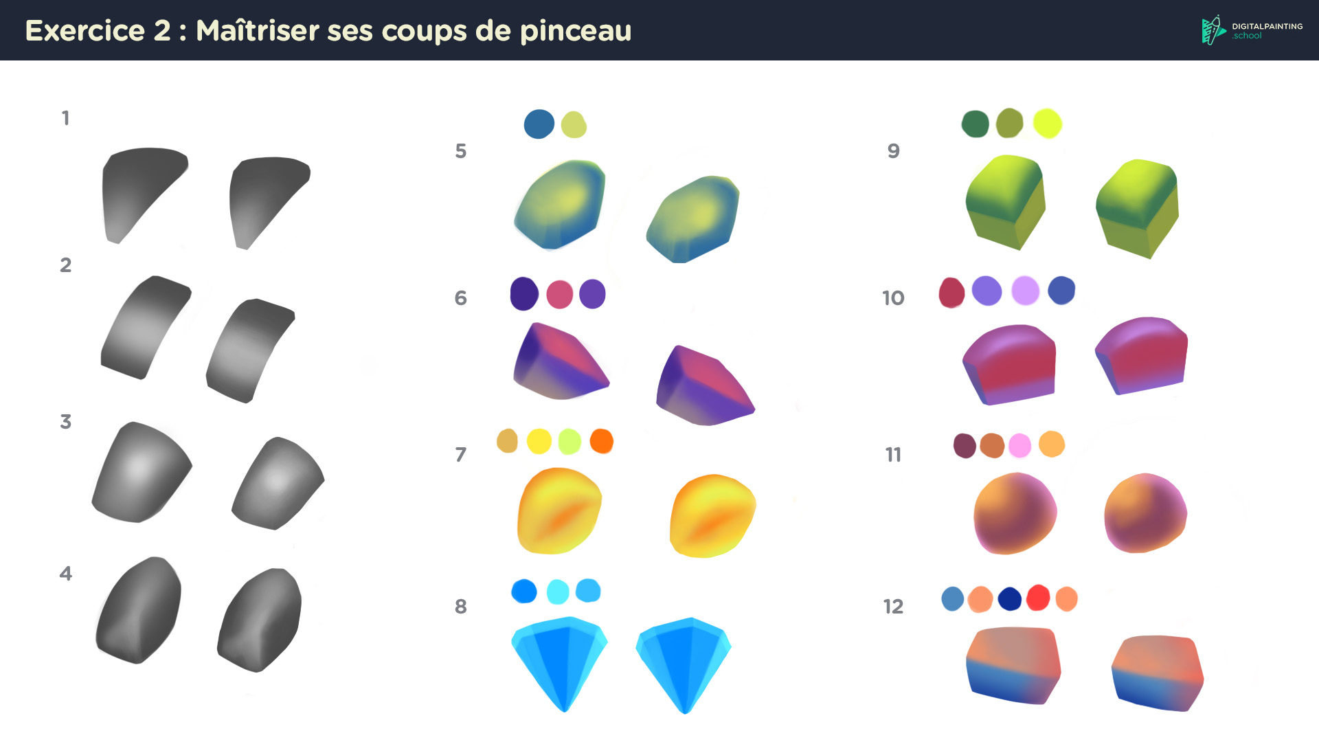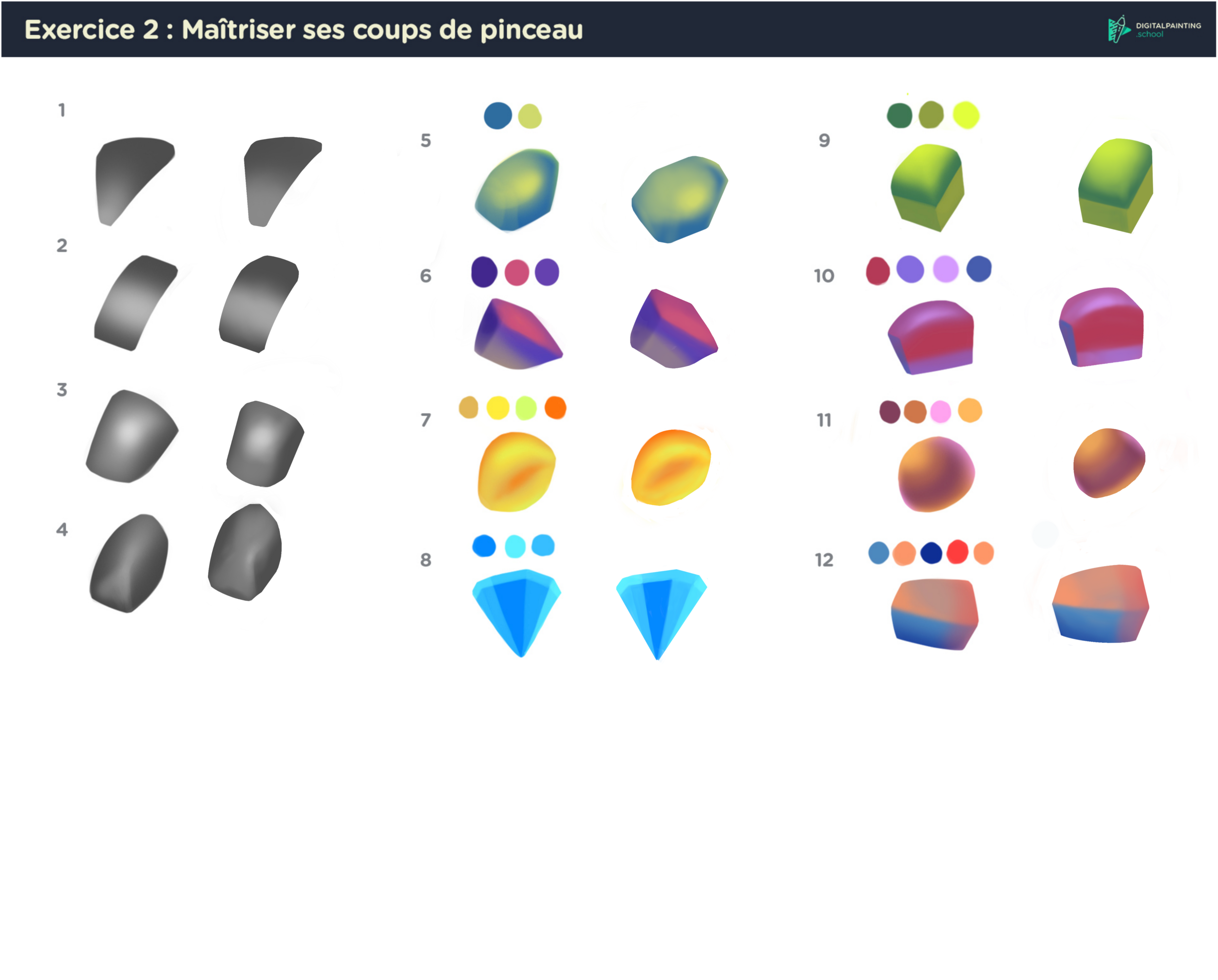 5. Hey, bien joué pour ces premiers exercices déjà! J'aurai tendance à penser que tu gagnerai à parfois plus "trancher" pour l'exercice 2.5, surtout pour la femme: Tu as utilisé des brush très softs et ça marche bien pour l'aspect dégradé, mais parfois, de faire des délimitations plus franches comme dans l'exercice 2 permet de créer des reliefs différents, un peu comme ce que tu as fais pour le col! En tout cas c'est déjà chouette, courage pour la suite!