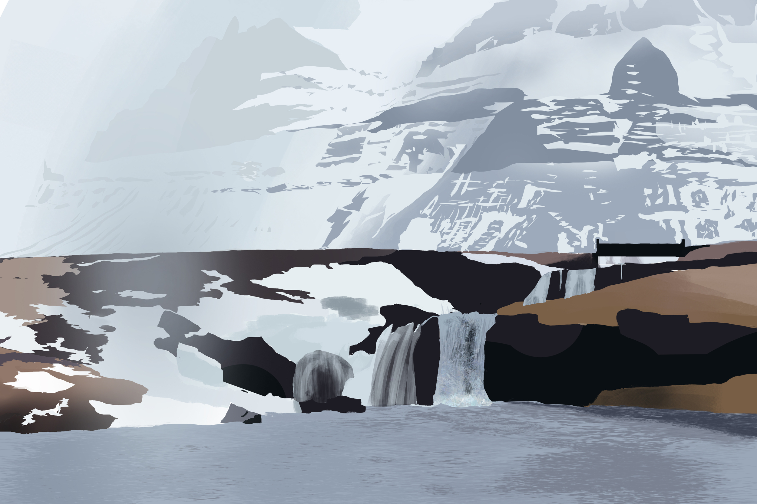 Hello, Ca prend toujours du temps au départ de trouver son process et d'être à l'aise avec ca, c'est normal ne t'en fait pas. Je pense que c'est pas mal parti, en fait au départ il faut travailler sur le plus gros puis le un peu moins gros et ainsi de suite jusqu'aux détails. Donc là je pense que tu as la bonne méthode. Dans un premier temps, séparer l'image en 3 zones ; l'arrière plan avec les montagnes, le 2nd plan avec le pont les cascades etc... et enfin le 1er plan, le plan d'eau. Une fois que c'est bien établi et que tu as trouvé une couleur globale pour chaque élément, tu peux attaquer les différentes zones qu'on retrouve dans le 2nd plan, séparer les zones enneigées et les zones de terre/pierre. Je pense que t'en est rendu à ce stade, et ensuite y'a plus qu'à affiner de plus en plus. Alors attention ici la zone de marron au dessus est pour l'instant vraiment trop claire, idem pour la zone beige en bas à gauche. il est plus simple le je pense de commencer par la valeur des ombres et ensuite éclaircir les zones en lumière plutôt que l'inverse. Keep it up !