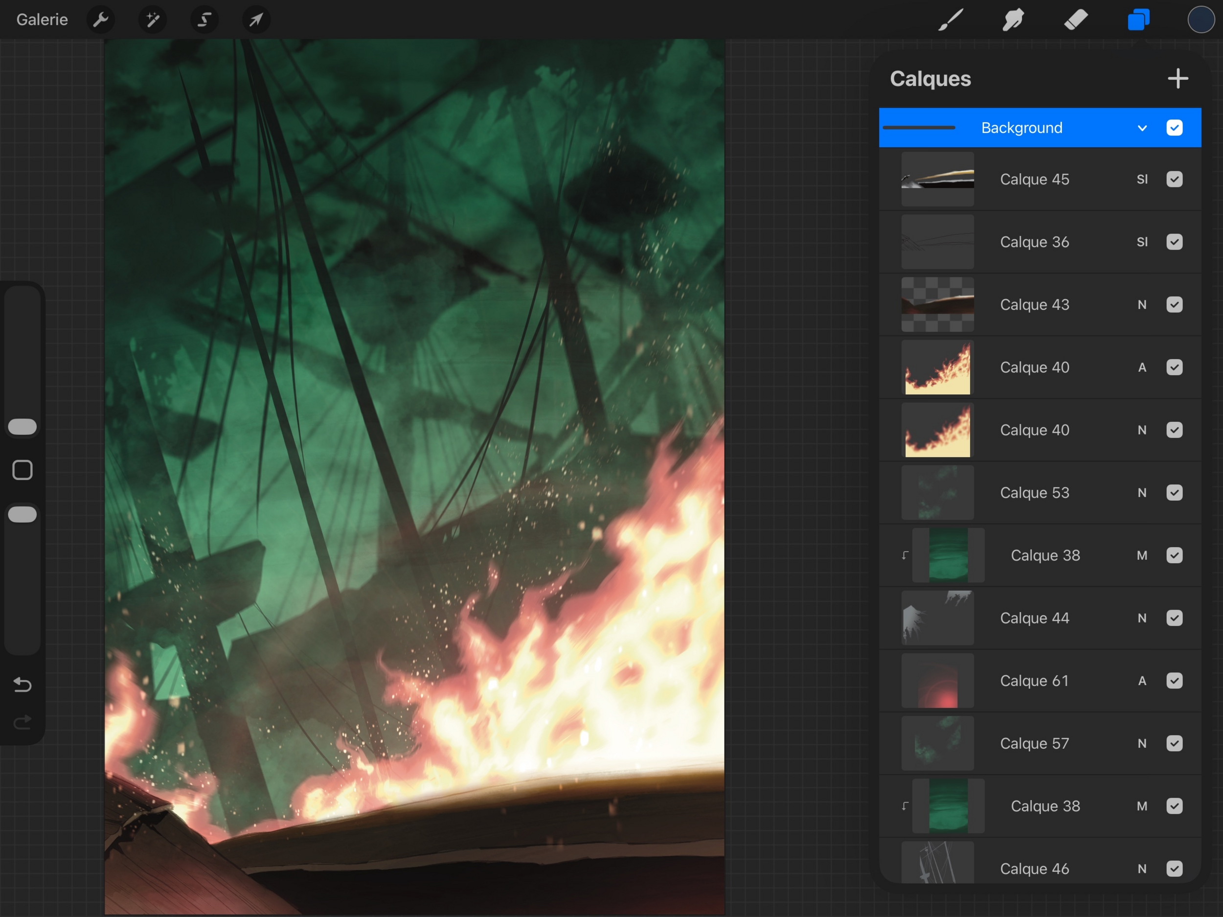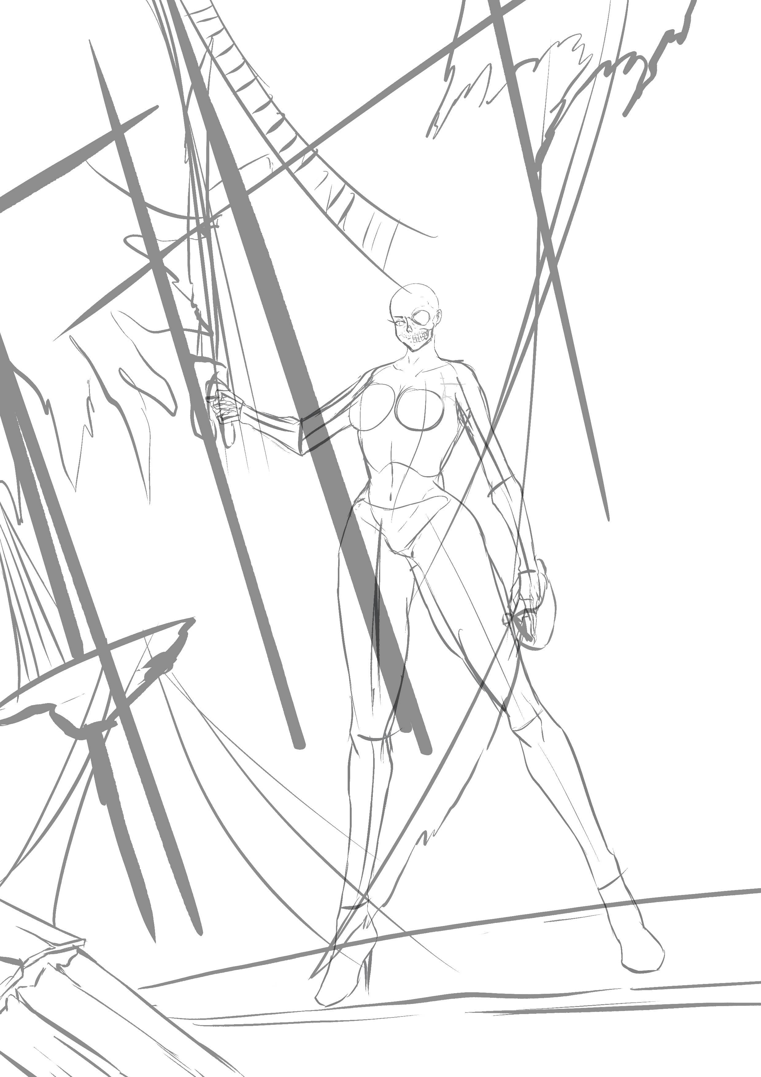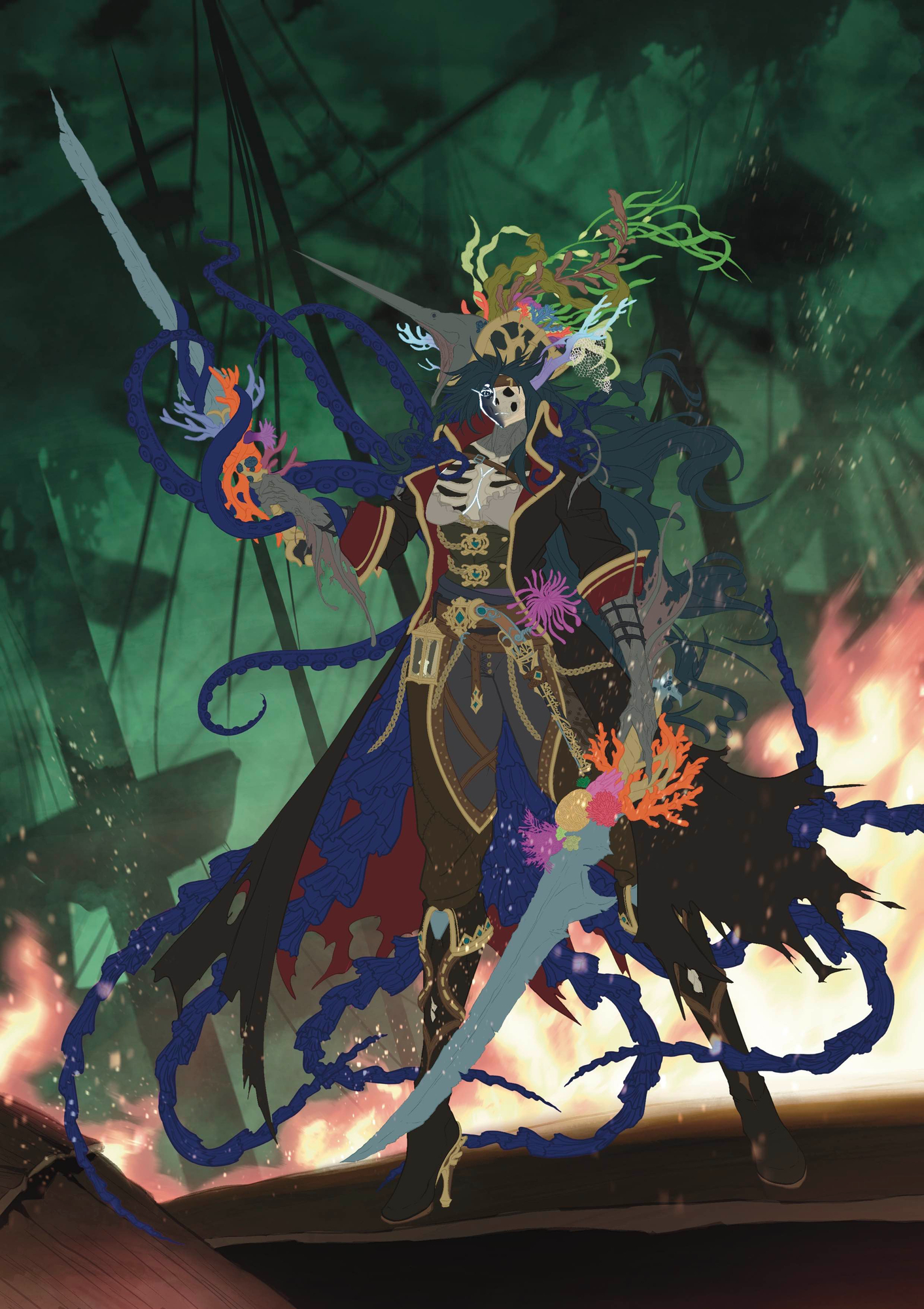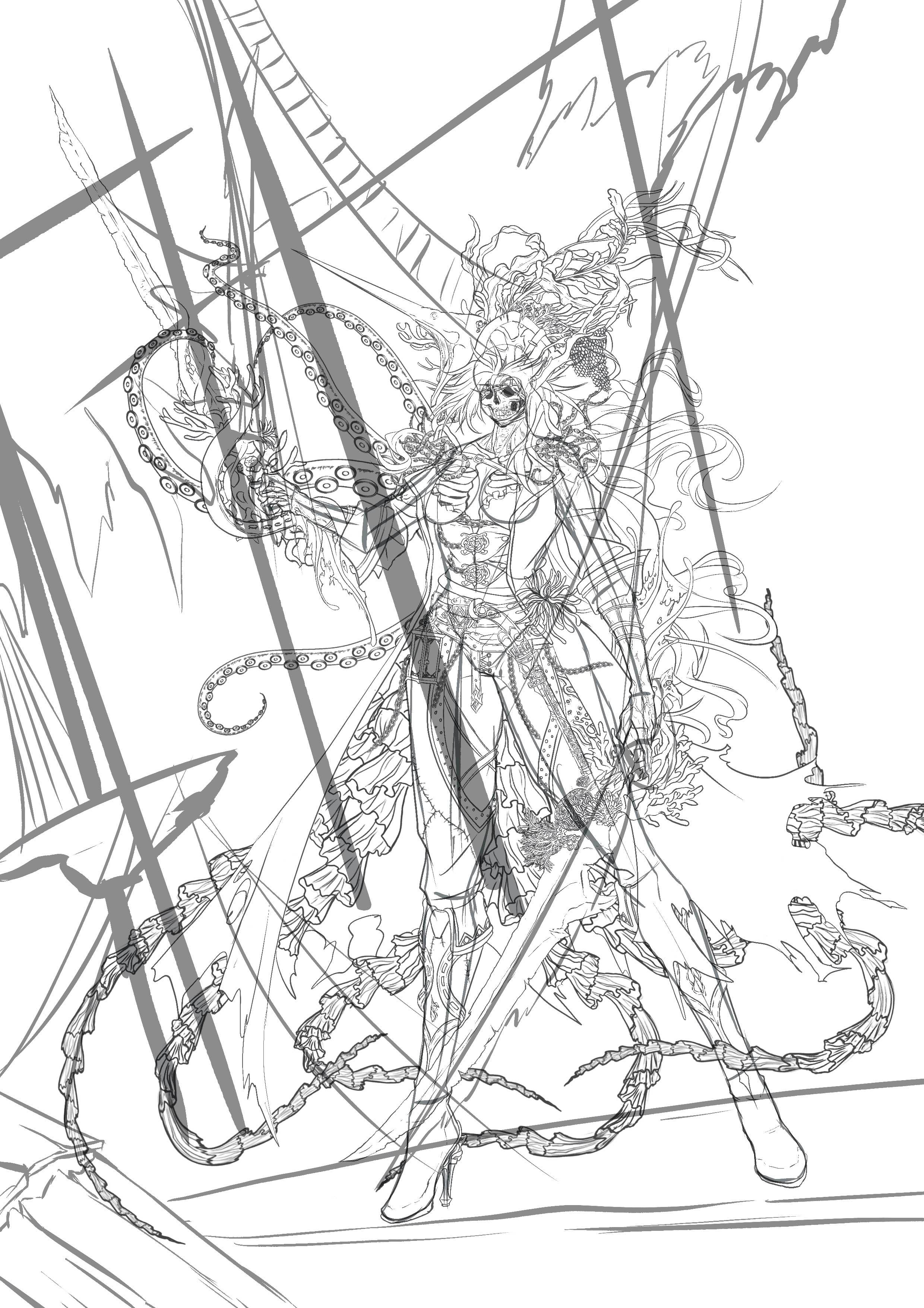 6. Bonjour à tous ! Je vous présente mon WIP de la Capitaine du Black Bones, des pirates déchu. L'intégralité de cette participation a été réalisé sur Procreate. Pour cette participation j'ai longtemps chercher une représentation de pirate maudit et ça ma redonné envie de revoir les films de "Pirates des Caraïbes" qui mon donné l'inspiration. Je suis donc partie sur un mix entre l'aspect mort-vivant du 1 et celle de Davy jones du 2 et 3. Au moment de la phase de croquis j'ai été interpelé par le visage de Ganny, le sorcière du jeu Elden Ring, avec son second visage fantomatique. Sa m'a donné l'idée que ma perso pourrait révéler son vraie visage au moment d'achever ses ennemies. Un peu comme si il était en face de la mort elle même! La partie détails était des plus éprouvante... A chaque fois que je dézoomais, me disant qu'il y avait suffisamment de détails, il fallait que j'en rajoute encore TwT. C'est pourtant le moment ou je me suis mis le plus de restrictions puisqu'à un moment j'avais tellement surcharger mon sujet de détails qu'il était devenue illisible. (Heureusement j'avais pensé à faire chaque détails sur un calque différents avant de les regrouper)