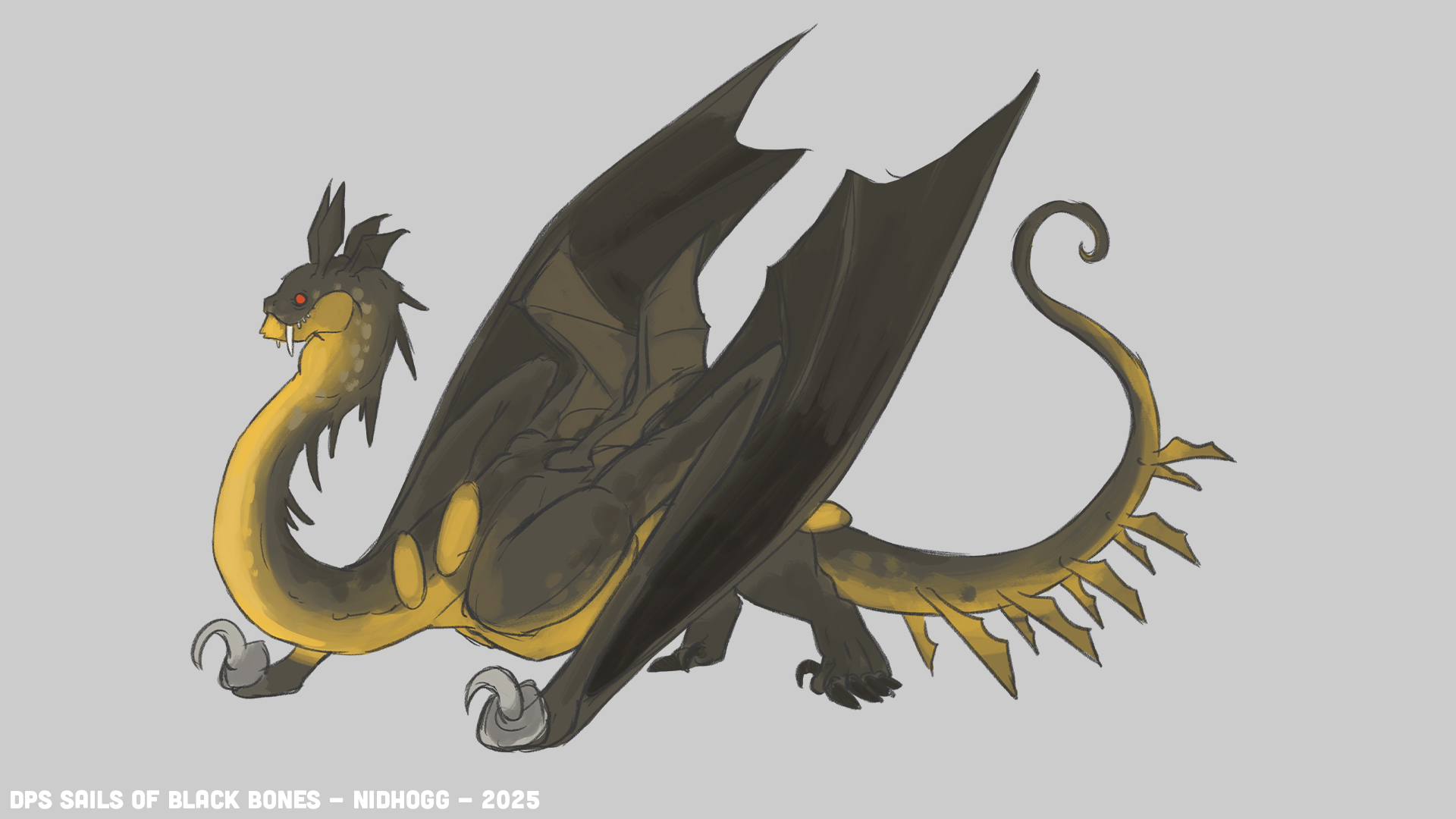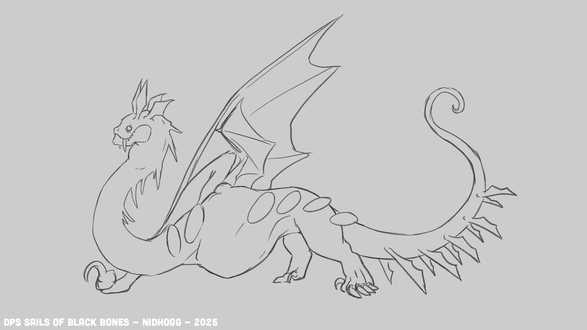 15. J'avais commencé à travailler dessus au tout début du Challenge mais par manque de temps je m'y remet que maintenant. J'ai choisi le Nidhögg car j'adore dessiner des dragons donc l'occasion est parfaite. De plus ce challenge est un bon exercice pour augmenter mes skills en concept art. Donc pour cette créature, je pars sur l'idée d'un dragon serpent comme décrit dans le brief, dont l'allure rappellerait celle d'un drakkar, étant donné que ce dragon fait partie d'un univers pirate viking. Dans mon idée ce dragon aurait d'énormes écailles sur les flans, rappelant les boucliers sur les drakkar, lui permettant de se protéger mais aussi d'accumuler de l'électricité. J'en suis au début de mon concept. J'aime bien l'allure que je lui ai trouvé là. J'essaye de peaufiner le design et de le préciser pour expliquer son fonctionnement.