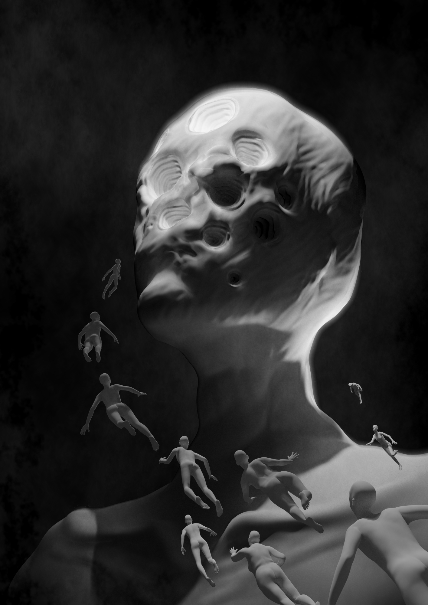 Je voulais plutôt faire de la couleur, avec peu de teintes, malades, entre-deux, finalement ça sera en niveau de gris. Parce que ça rendait bien, et avec le thème, et aussi parce que le peu de couleur testé n'était pas super. Je vais ajouter une texture sur le buste pour être moins lisse que la 3D. La texture devait donner la couleur et ça sera finalement en niveau de gris. Je n'ai pas encore toucher aux personnages, qui seront un peu vaporeux je pense. Je mettrais plus de fumée aussi. Les trous dans la tête sont pour la santé mentale, et les petits personnages sont pour les hallucinations qui veulent entrer dans cette tête, qui est poreuse. -
