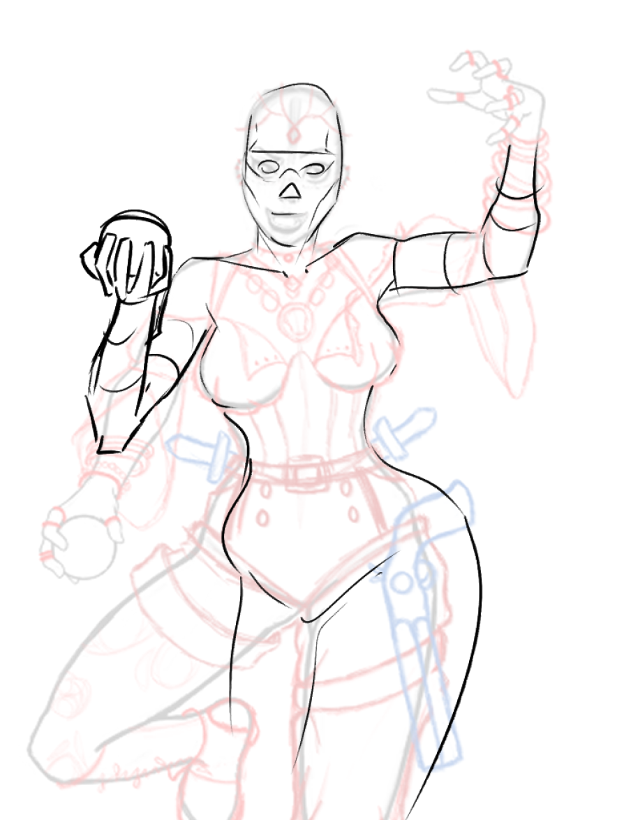 Finalement, j'ai décidé de travailler différentes poses sans décalquer xDDD donc j'avais mes modèles sur un écran et je dessinais sur l'autre. Je suis pas mal resté sur mon angle en plongée avant de faire une pose de face, inspirée par Wanda la Sorcière Rouge 🙂 Et j'ai totalement flashée sur la pose et sur ses hanches sexy xD -