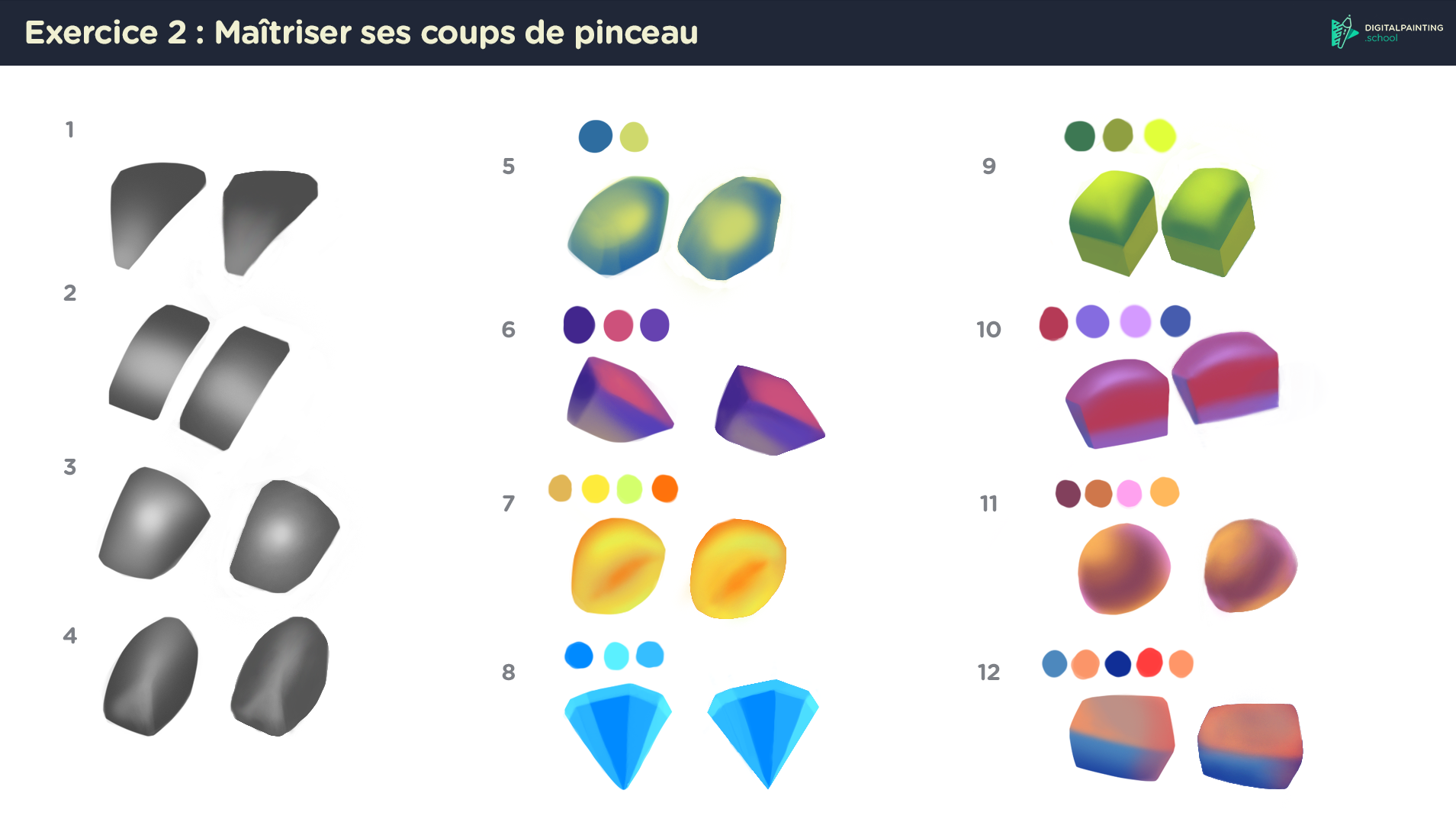 Salut @veloursdigital😉 Pourtant le résultat au niveau de tes couleurs est plutôt chouette 👍 Après je ne vois pas trop ce que tu veux dire par "avoir des couleurs avec un bon blending" tu veux peut être dire obtenir de bonnes transitions entre les couleurs? Parce que dans ce cas, je dirais que ça va passer par : de la pratique forcément, mais également un bon réglage au niveau de ton brush, en jouant notamment avec l'opacité le flux et la sensibilité de ton stylet, ainsi tu pourras réaliser tes blendings avec plus de précisions 🙂 Mais ne t'inquiètes pas ça va venir, d'ailleurs il y a des exercices pour ça après 😉 Sinon au niveau des formes c'est un bon début là aussi, on voit que sur certaines ça été un peu plus dur, mais là aussi c'est normal : comme celle-ci par exemple 😉 n'hésite pas à faire des flips horizontaux de temps en temps, ou à tourner ton document pour avoir plus de facilité à réaliser tes formes, ça devrait t'aider 😉 Pour l'exercice 1, ça tremble un peu mais ça passe 😜 Alors à toi de voir, là perso, j'essayerais d'aller un peu plus loin, en affinant un peu plus les formes : comme ici par exemple, c'est très brouillon 😉 même chose pour le personnage, au niveau des formes, juste pour t'entrainer 😉 La base est là, mais ça serait bien de la pousser un poil plus 😉 Allez continues comme ça c'est bien ✌️