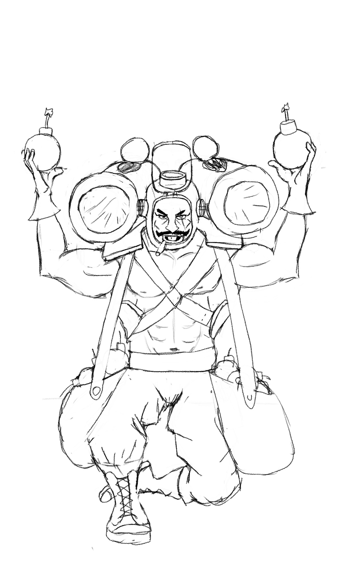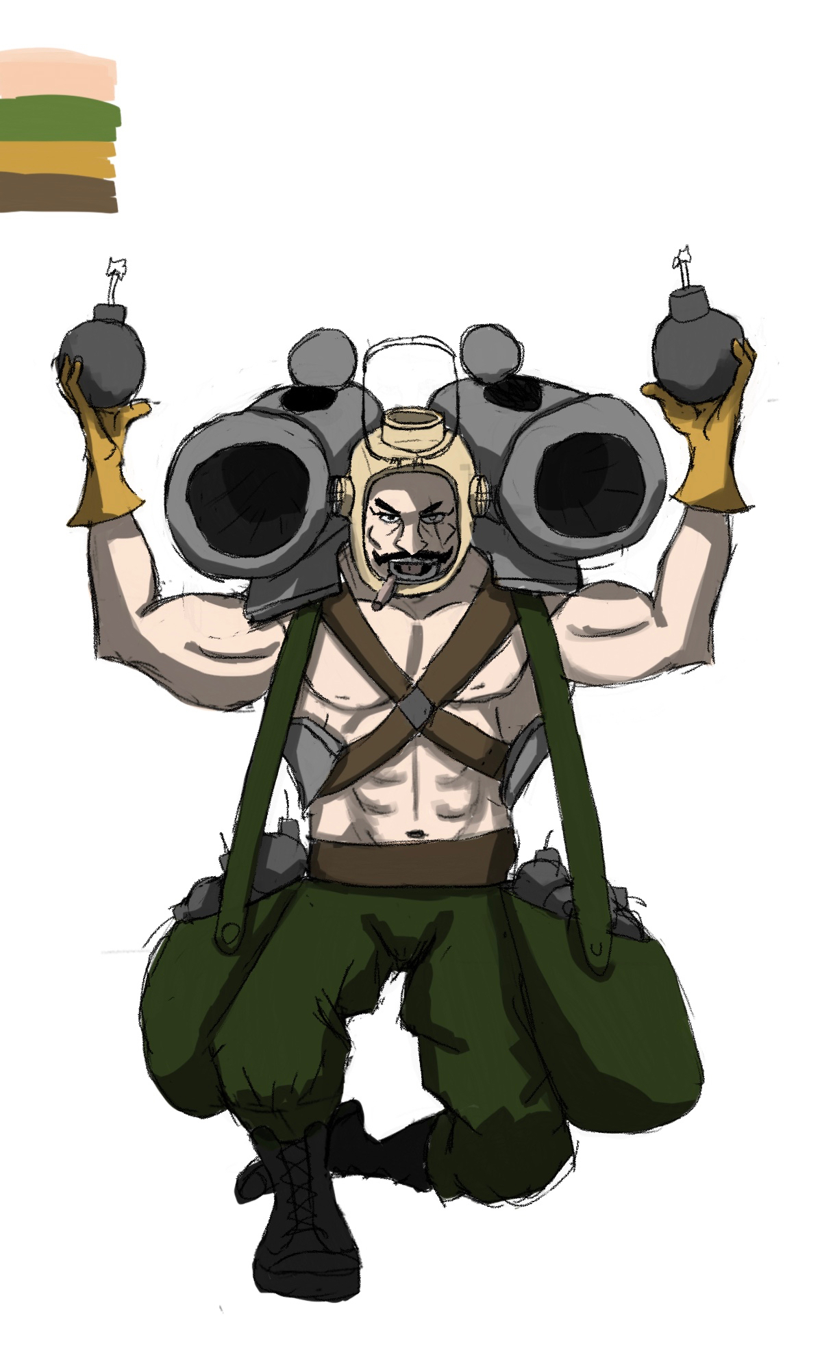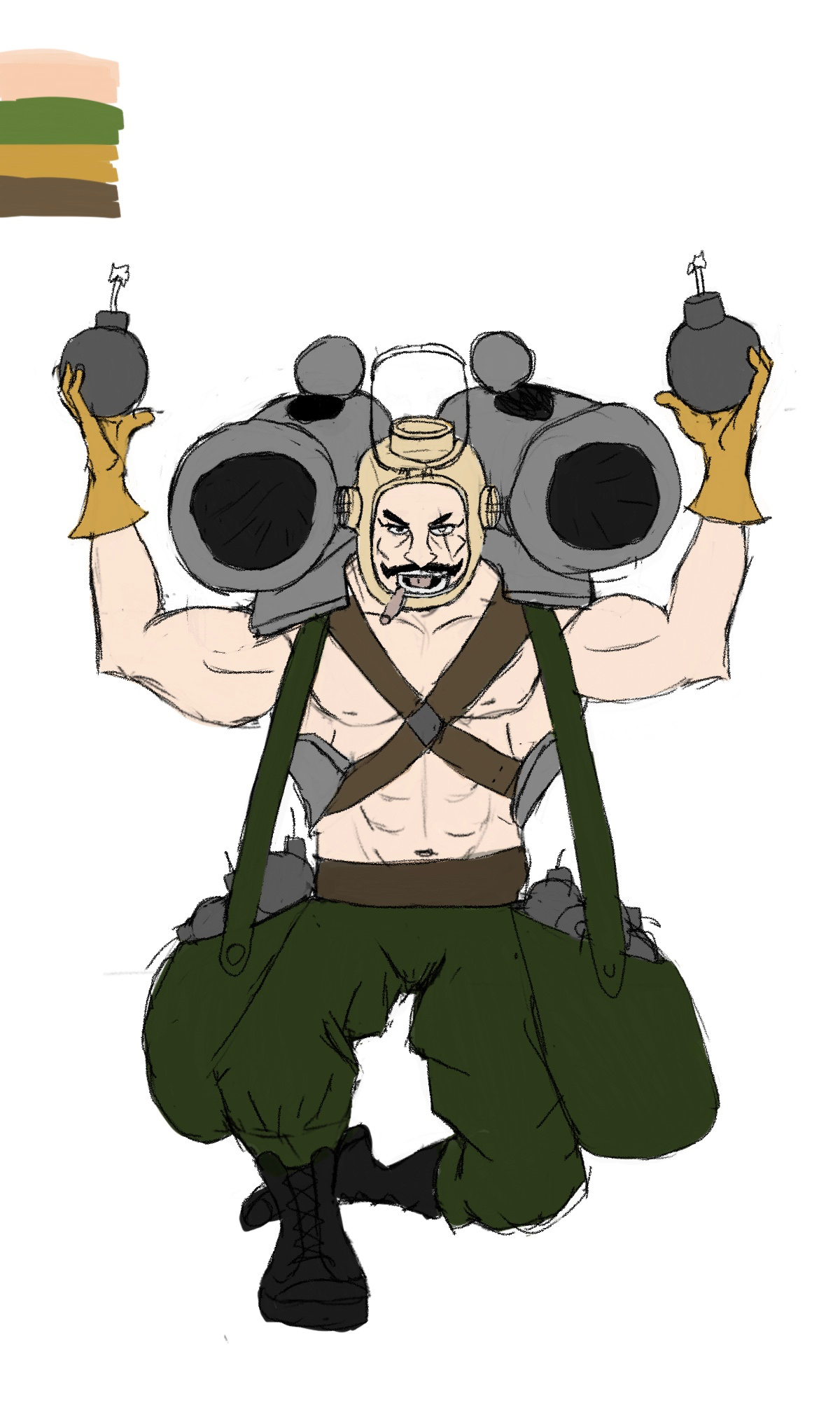 J’ai aussi fait le troisième personnage de ma triade. Boom-Boom que j’ai imaginé très musclé, moustachu et au début avec la peau brûlé mais c’est l’ajouter une complexité inutile. -