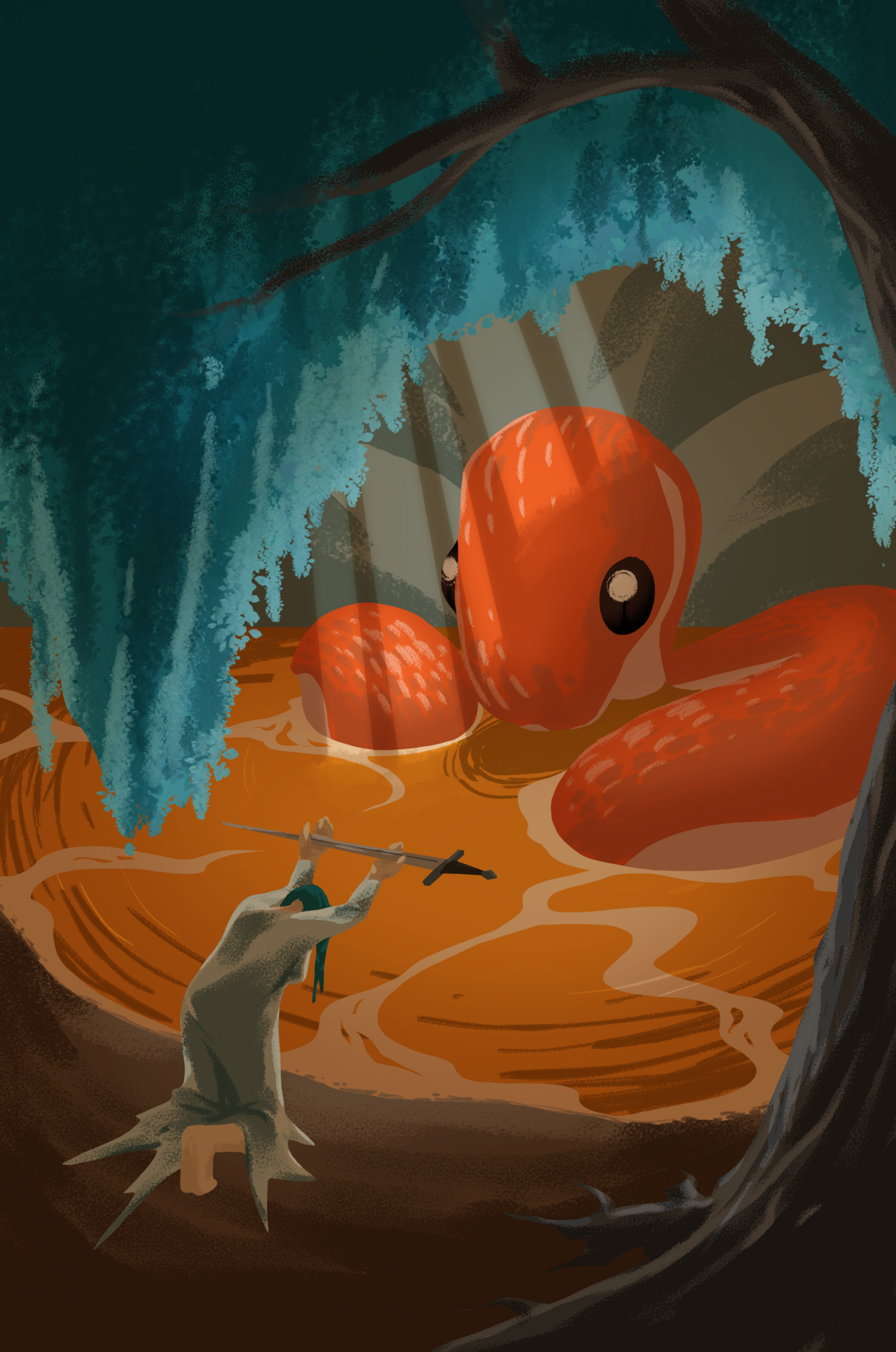 Et c'est parti ! Premier digital painting sans lineart pour ma part. Perspective et couleur, mes points faibles ! Univers de fantasy médiéval, où une femme vient offrir une lame à une créature mystique résidant dans un étang caché. Sera-t-elle dévorée ? Rejetée ? Acceptée et transformée ? Hâte de voir les détails de la prochaine version que je pourrais ajouter, suggérant ses combat, une origine paysanne, et sans doute complexifier la créature (bienveillante, malveillante... ? A suggérer aussi !). -