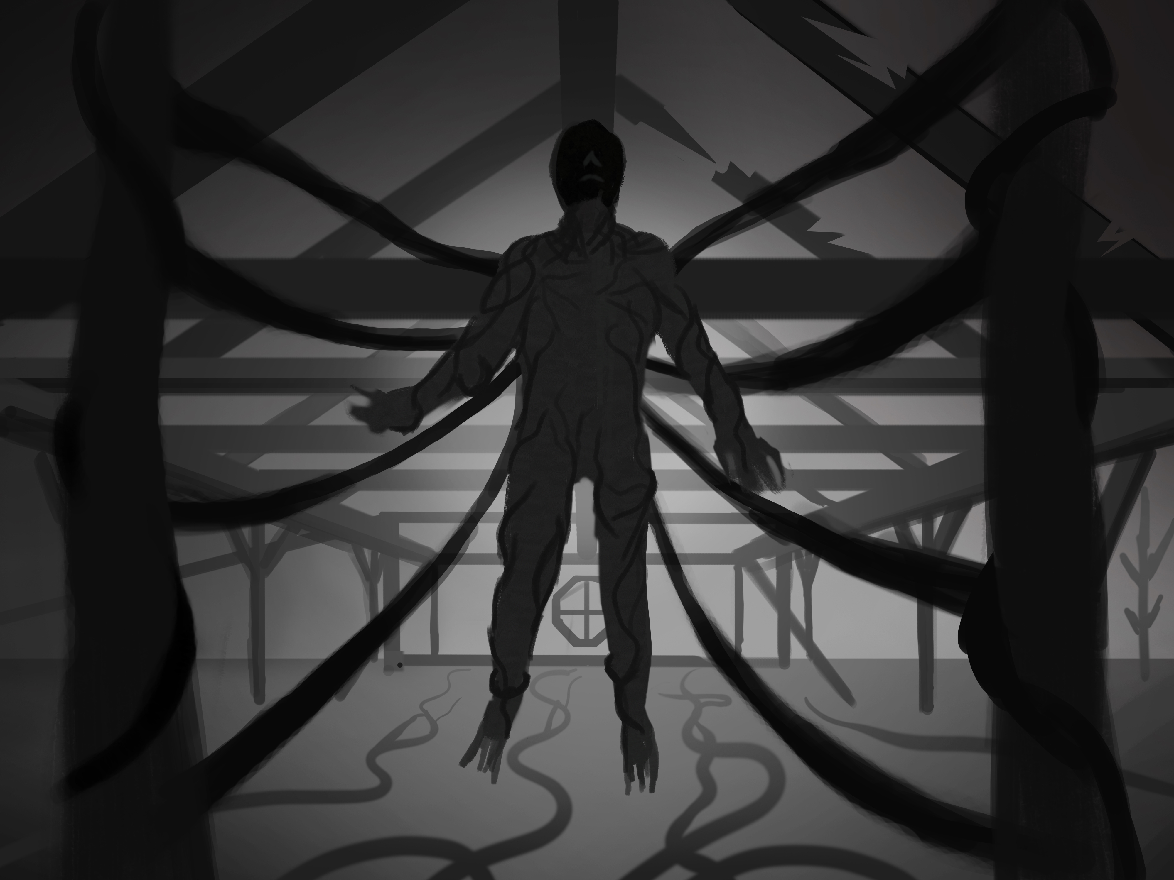 Voici mon dessin ou (plutôt sketch ?) de départ demandé au Chapitre 0 afin d'évaluer ma progression à la fin du programme. Pour ceux qui l'auront reconnu c'est une représentation d'une scène, notamment du personnage de Vecna dans la série Stranger Things. J'ai pas voulu tenter la couleur je pense que c'est encore trop complexe pour moi haha je me suis dis que déjà de poser les bases en noir et blanc ce sera pas mal et je verrai le reste plus tard. Je pense que j'ai visé un peu haut pour mon niveau actuel mais je pense aussi que c'est pas si mauvais pour commencer.
