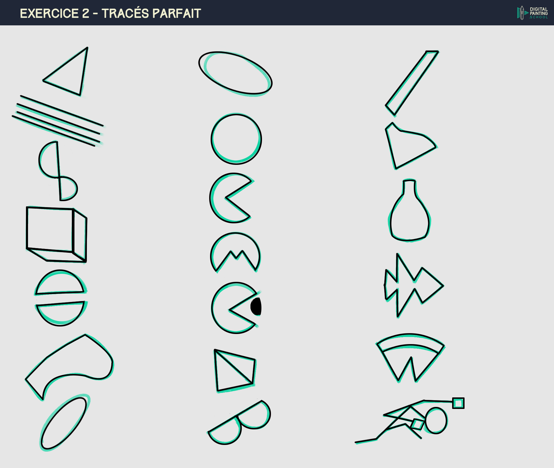 Hello hello, me voila enfin au chapitre 2 après être restée un an au chapitre 1 o/ voici mes premiers exercices Avant de passer la suite, je pense refaire quelques formes du premier exo, notamment ceux avec l'outil plume parce que ce n'est pas encore naturel pour moi de l'utiliser. Pour le deuxième exo, je pense le refaire. Je ne vous dis pas le nombre incalculable de fois où j'ai refais tous les traits 😂 et je trouve que c'est encore hésitant à certains endroits. J'ai eu l'impression aussi que ça ne dépendait pas seulement de mon poignet mais aussi de la manière dont je place/bouge mon bras/mon épaule ?