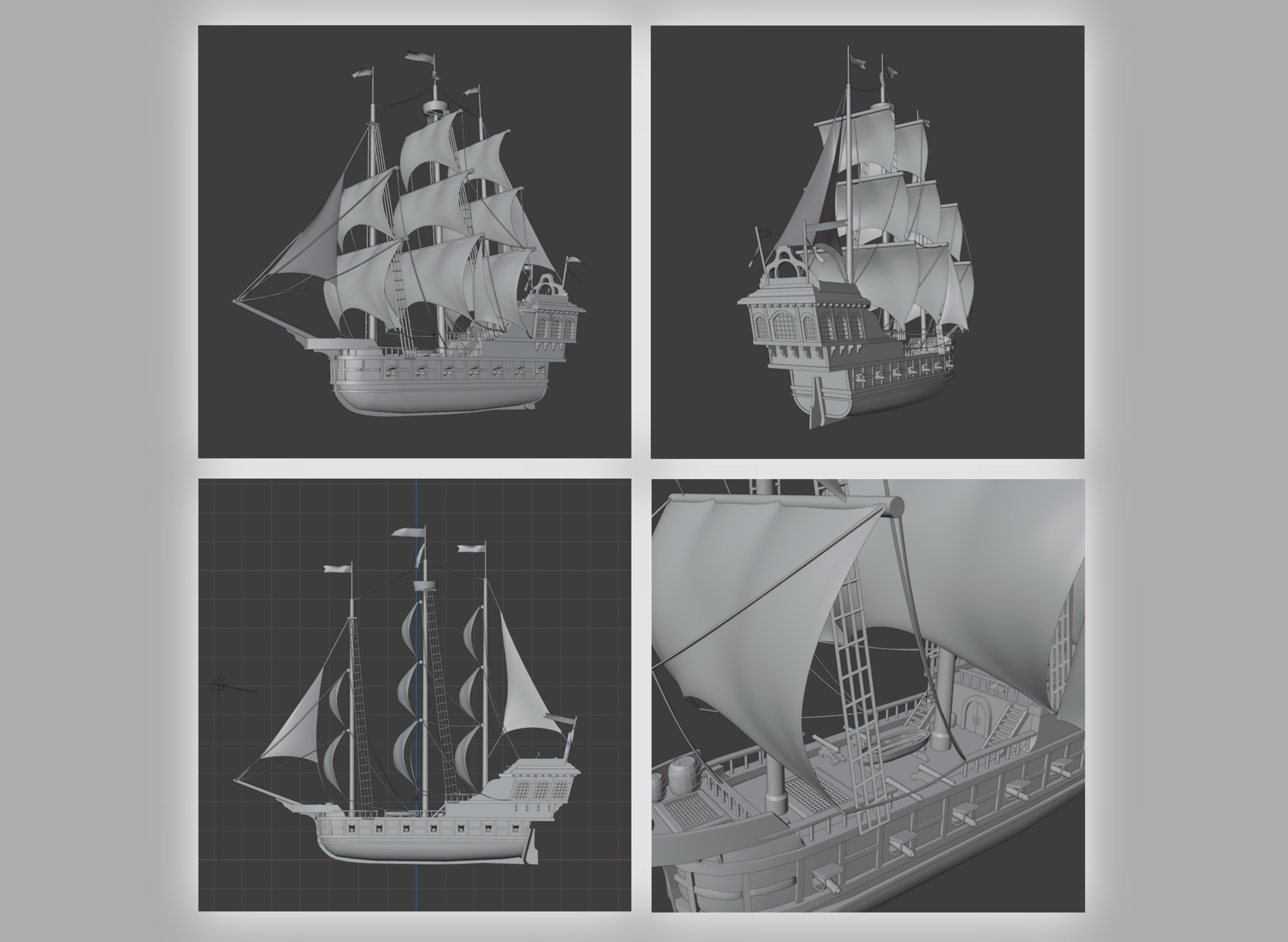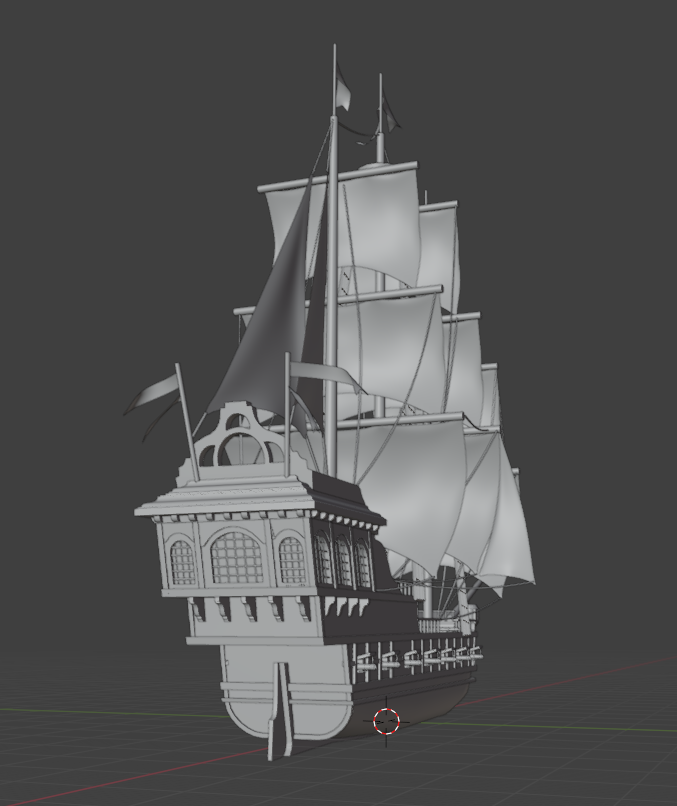 Pour obtenir les volumes corrects du navire dans la perspective et l’angle de vue que j’ai choisis, j’ai réalisé un modèle 3D sur Blender, avec une simulation de vent pour gonfler les voiles et faire flotter les drapeaux de manière cohérente ! Et voici l'angle de vue que j'ai utilisé dans la scène. -