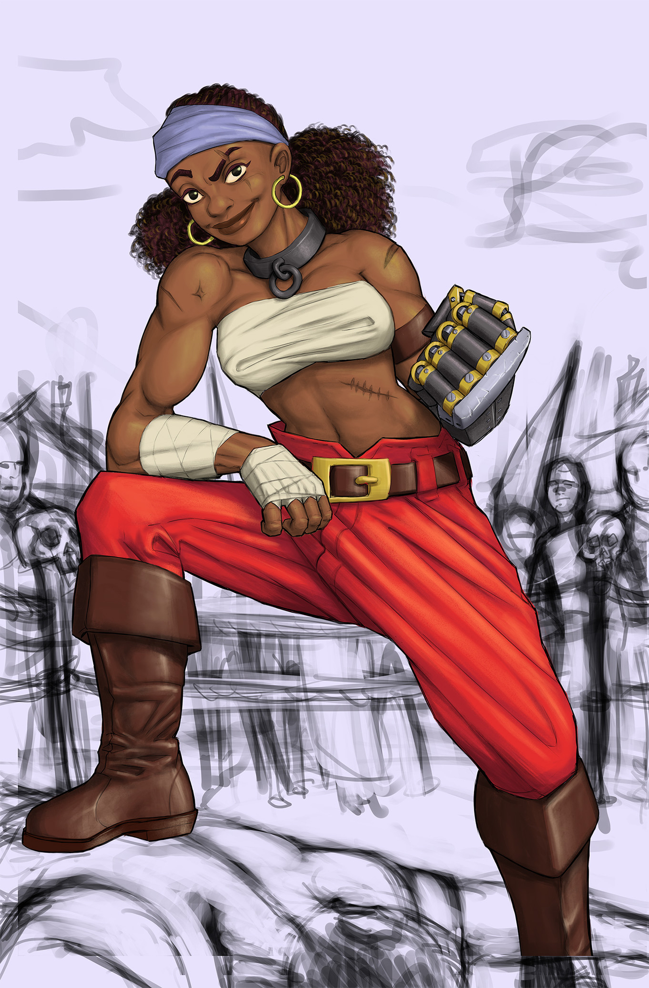 Voici l'avancement de la semaine. J'ai travaillé le rendu du personnage avant d'avoir défini le fond mais j'arrive avec une proposition encore très brouillon à ce stade sur ce point. On voit le personnage avec le pied posé sur un gars qu'elle a mis KO. La scène se situe dans une sorte d'arène entourée de piquets avec un public autour et au fond on peut voir quelques bâtiments et mats de bateaux. C'est une proposition mais ce n'est pas complètement fixé à ce stade.