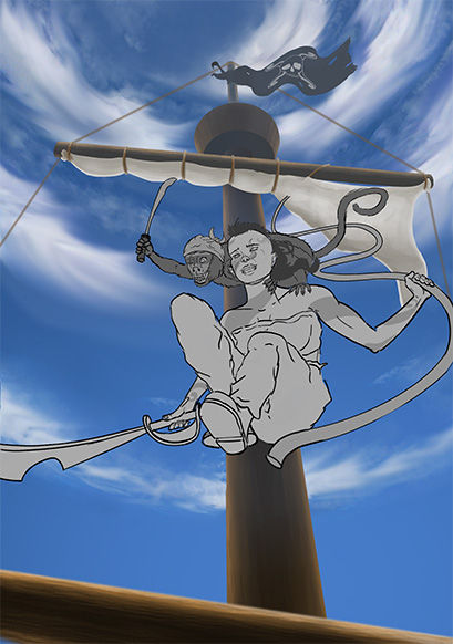 Je suis enfin passé sous krita, j'ai ajouté quelques ombres, j'ai testé les cheveux dans les tons légèrement violet, initialement je voulais les faire bleuté et j'ai ajouté une ébauche de Sakado derrière mais on ne le voit pas assez pour le moment. Il manque encore quelques armes, pour une pirate je pense que c'est indispensable!