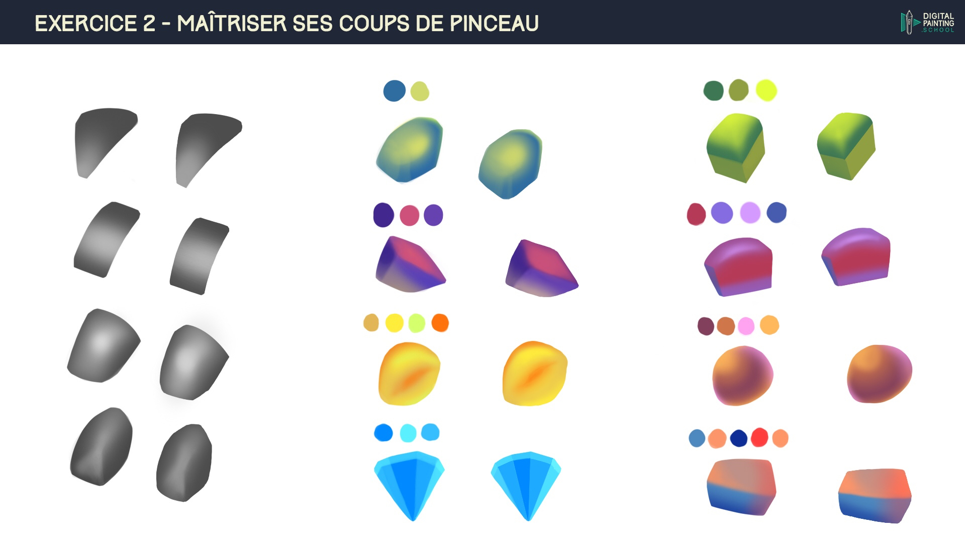 Merci beaucoup pour les retours @Djayk . Du coup j'ai refait l'exercice avec les bonnes couleurs. Pour la dernière forme, je ne sais si c'est la bonne méthode mais j'ai utilisé la gomme pour estomper un peu le centre de la couleur du dessus.