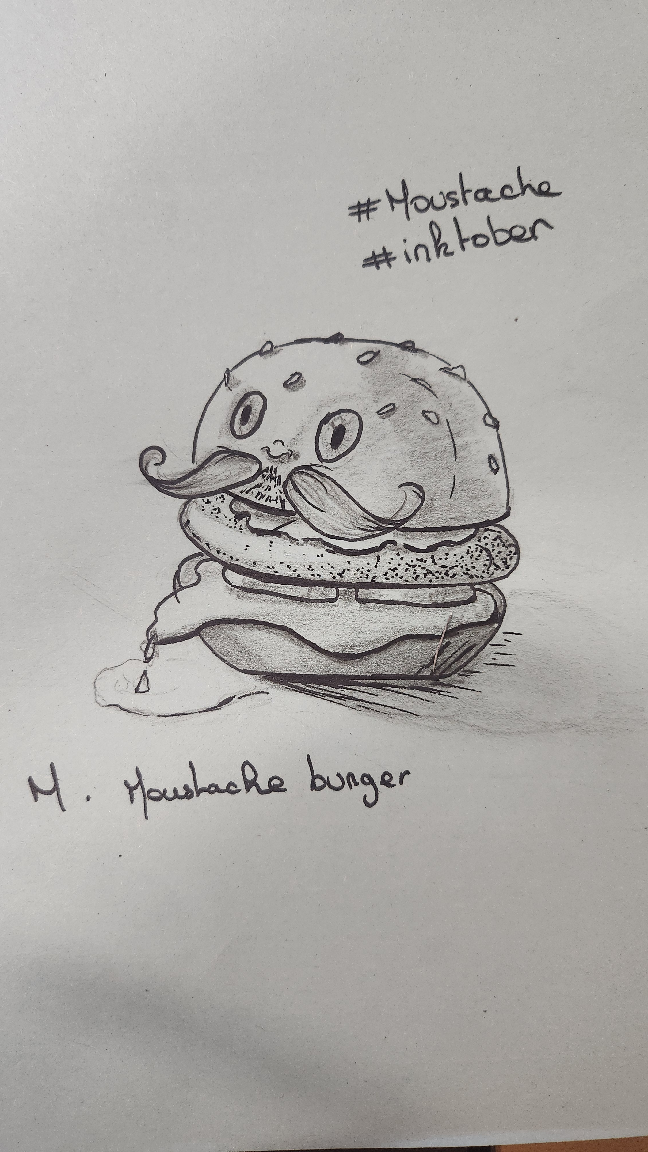 Fait avec les moyens du bord , un crayon HB, une gomme et un paper mate noir (au travail 🤣😅) Petite dédicace au kebab de ma ville qui s'appelle Moustache Burger Bravo à tous mes camarades pour vos illustrations 😉💪🏼
