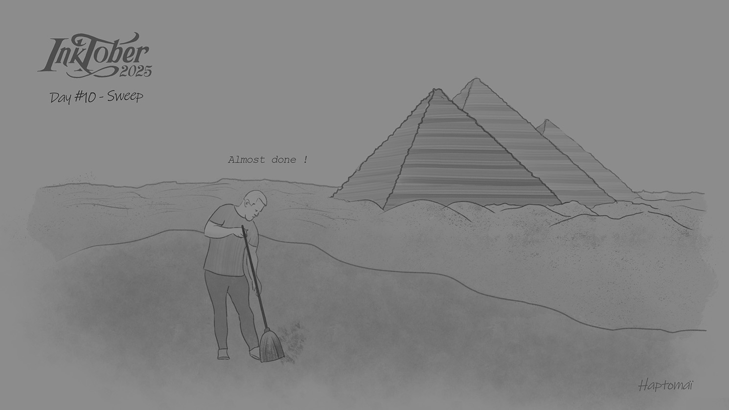 Bonsoir tout le monde ! Je m'en viens faire une p'tite tournée de commentaires après mon baby-sitting éreintant. J'ai dû garder le bébé d'un an de ma meilleure amie de 8h à 18h, au secours, ce que c'est énergivore ces bouilles d'amour ! 😱 Je vais essayer de dessiner mon mot ce soir et de le poster à temps, mais je promets rien. @HaeresisSuper la ref à nos irréductibles Gaulois préférés. Le mouvement est réussi. @RockenrollaUn beau coup de balai chez toi aussi ! @1 neasAh, j'aime beaucoup l'idée, c'est plus dans ce genre de balayage que je pensais partir. La scène est bien lisible, top ! @juliaBlanchardToujours aussi cool tes cartes ! @HaptoMaiExcellent ! 🤣 Plus que quelques milliards d'années à tenir avant d'en venir à bout. @bussi29et @daffJ'adore vos refs à nos tendres vieux Disney ! @oknim7Toujours au top ! La scène est super fidèle à la personnalité de tes personnages. J'adore ce que tu crées depuis le début. Ce sont des personnages que tu as créés pour l'occasion de cet Inktober d'ailleurs ? Je sais plus si tu l'avais précisé. J'adore ce que tu nous racontes d'eux tous les jours, et leur complicité qui se dégage. 🥰 @yubelsTu n'es pas restée sur ton idée des monstres alors ? @fred21Ne te surmène pas, c'est déjà bien d'avoir une idée tous les jours et de tenter quelque chose. 👏 @marina_sSuper l'idée. Parfois, il faut savoir balayer ce genre de désagréments, mais éviter de les oublier sous le tapis trop longtemps. @DiamonesEncore un superbe coloriage ! Peut-être que tu pourrais renforcer le contour du personnage qui ne se détache pas très bien du fond. @stefouJ'adore ! ça m'évoque un peu Sous les Arbres. @Image.In.RAha, c'est rigolo de voir ton étoile de mer mise en scène depuis quelques jours ! 😁 @Fl0ck0nWouah, superbe exécution, et c'est presque poétique. Je te souhaite plein de bonheur à venir avec cette heureuse prochaine arrivée, courage pour le passage à la maternité. Je penserai fort à toi. ♥ @ApostroKeFidèle à ton style ! Mais étonnamment plus "apaisant" que le reste du temps. On ressent presque la lassitude de la Mort. @GopperusIl va n'en faire qu'une bouchée de ce tas de poussière. Tu redoubles d'inventivité dans tes scènes, beaucoup de storytelling, c'est chouette ! @Julie LTout en douceur, encore une fois. Le pôtit chat qui se la coule bien douce, fidèle à lui-même. @ShelterJ'espère que ça ira mieux demain, courage, câlin. C'est top ce que tu fais depuis le début, continue comme ça ! @fabioEncore une excellente ref et une réappropriation désopilante !