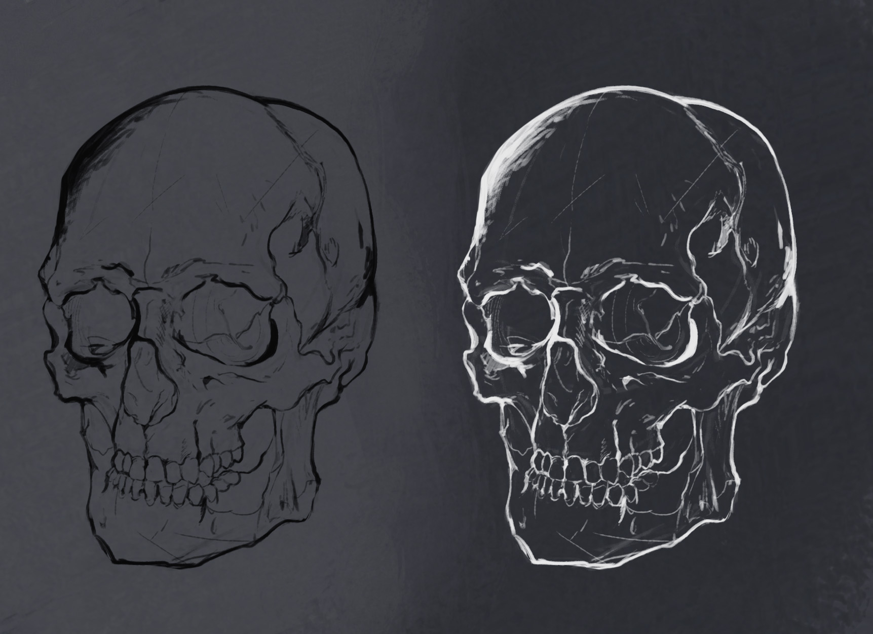 Voici pour le croqui du crâne, pour celui ci je me suis dit que ce serait interressant de tester de dessiner en clair plutot qu'en sombre, je l'vais deja fait en dessinant des pse de statues grecs. Dnc c'est aussi ce que j'ai fait ici, j'ai quand meme fait un petit CTRL i pour voir ce que ca donnait et les deux resultats on leurs carmes je trouve. J'avoue que j'avais pas mal la tete dans le guidon pour cemlui ci vu que j'adore le sketch donc je suis surement passé a coté de certains trucs ! -