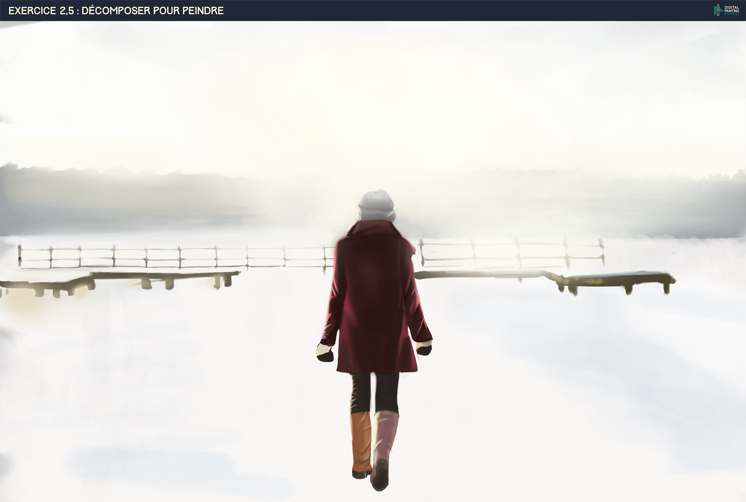 Hey @Dans la Brumebienvenue dans le chapitre 1 🙂 Super début d'exos ,bien joué !:) pour l'exo 2 c'est rvaiment good : attention juste à tes rebords irréguliers sur ces différentes parties 😉 ici tu as une tâche bleue un peu trop prononcée 😉 attention a ta forme ici qui est trop allongée en hauteur par rapport à ta forme de référence pour l'exo 2.5 franchement c'est vraiment très réussi bravo ! c'est rare d'avoir ce degrès de finitions et de rendu !:) : Juste pour chipotter tu peux peut être juste venir floutter un peu plus ta ligne dhorizon entre la neige et la forêt ref tu as aussi ces deux couleur bleu qui dérange un peu par rapport au reste dans ton fond et au niveau de tes bottes ta couleur est un peu trop saturée et orangée tu peux venir désaturer un peu 😉 sinon c'est vraiment bien continue comme ça 🙂