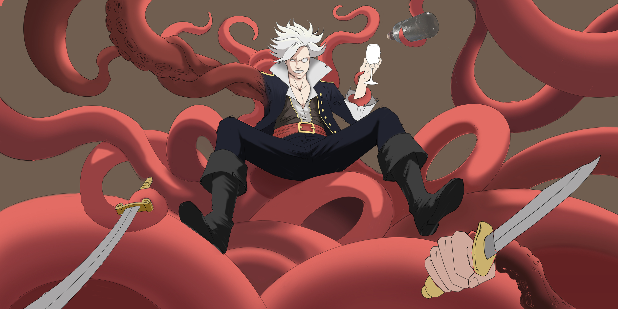 Voici l'image finale ! J'ai opté pour les couleurs rouge et jaune qui rappellent les couleurs de la Chine et qui mettrait en avant le personnage principal. L'orang outan au pelage pâle a été pensé pour ne pas attirer l'attention contrairement à la couleur ocre du pelage naturel de cette race de singe. Le rose et le jaune de sa gueule viennent attirer l'attention sur sa tête, la couronne renforce cet effet. Le bas des personnages est obscurcit subtilement avec un effet mouillé pour garder l'attention sur leur partie haute, à l'exception des pointes des bottes de Lame Bleue qui se distingue de la monochromie du bas de l'image. Ca crée en même temps plus de cohérence avec la scène de débarquement où ils doivent marcher dans l'eau pour atteindre la terre puis avancer vers leur destination. Pour le décor je voulais une atmosphère de nuit froide, presque mystique, inspirée des scènes d'infiltration et de tension des films Pirates de Caraïbes. La météo est nuageuse, et le vent se lève, il bruine avant que l'orage éclate. Une météo très propice à une infiltration et à une scène de tension ou de combat épique à venir. Au loin, la flotte s'exécute et prend le large pour aller créer une diversion comme Lame Bleue l'a ordonné. Les silhouettes des jonques dans l'obscurité sont menaçantes et les bateaux semblent encouragés par le vent. Les lanternes et les torches de l'équipage transpercent la froideur du décor, une sale nuit les attend mais la capitaine ne tolère pas les manquements, son singe non plus.. Merci pour votre attention et que vos lames jamais ne se ternissent ! Ni vos stylets ! -