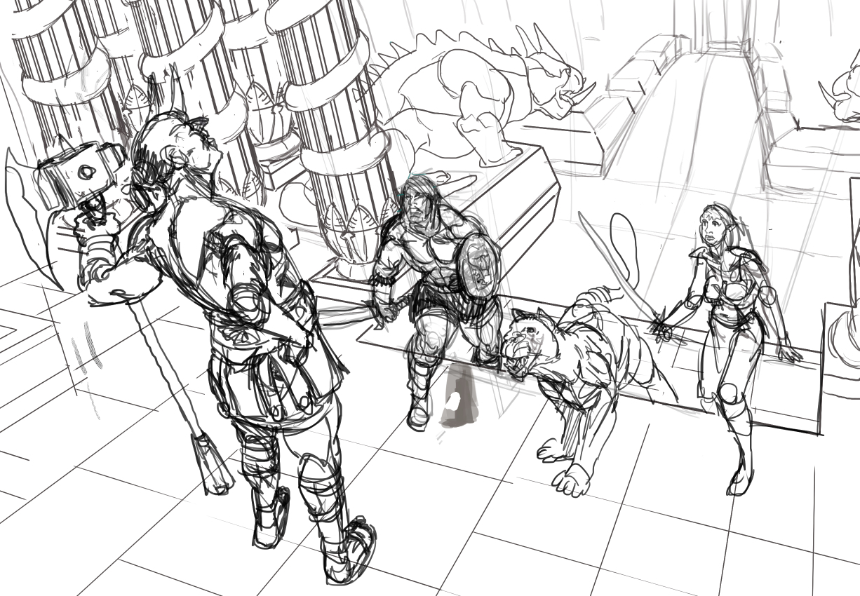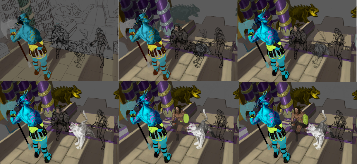 Les petites recherches dont je n'ai pas gardé grand chose Des idées de visages La composition et designs presque finaux Le croquis final Les étapes de colorisation