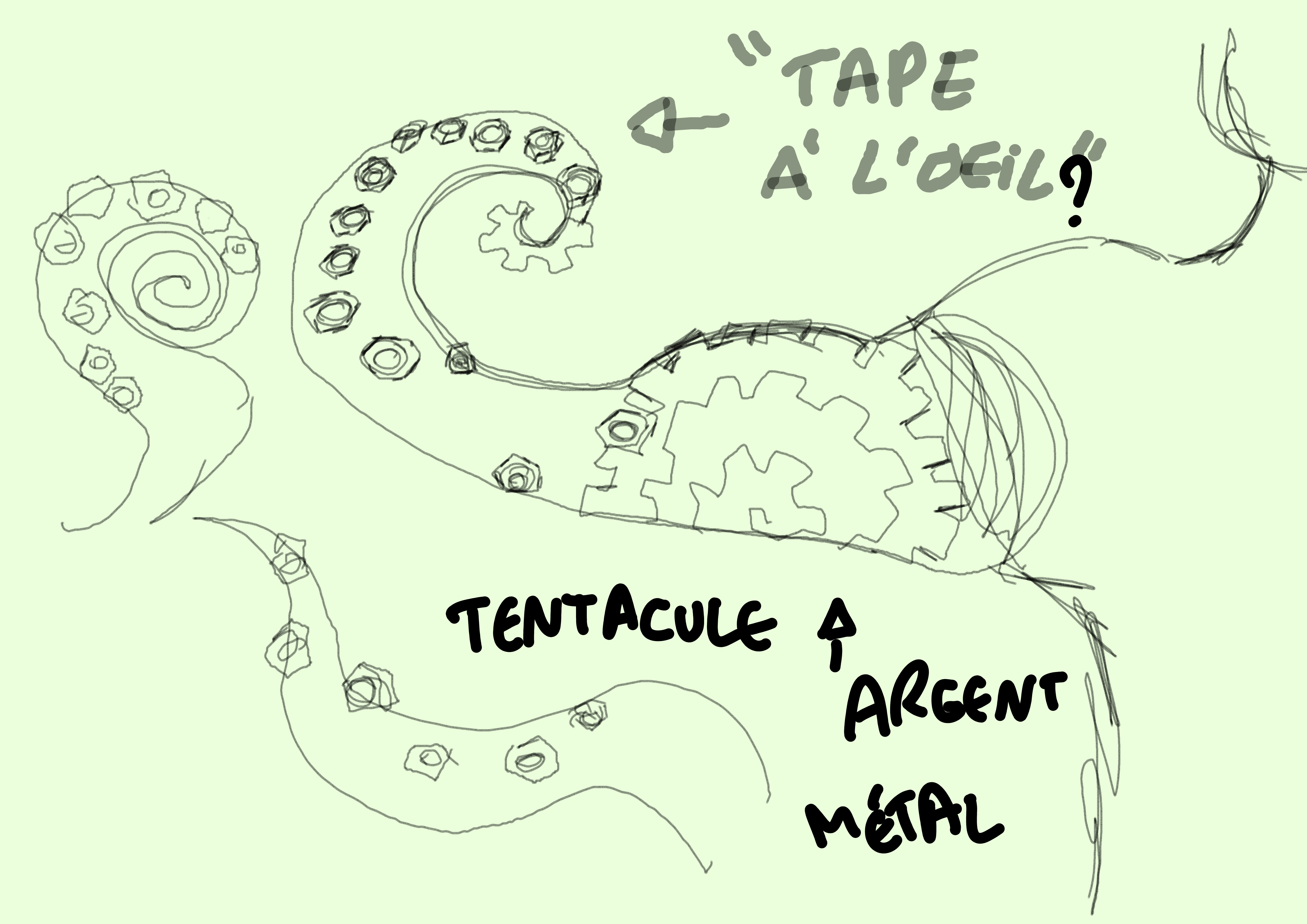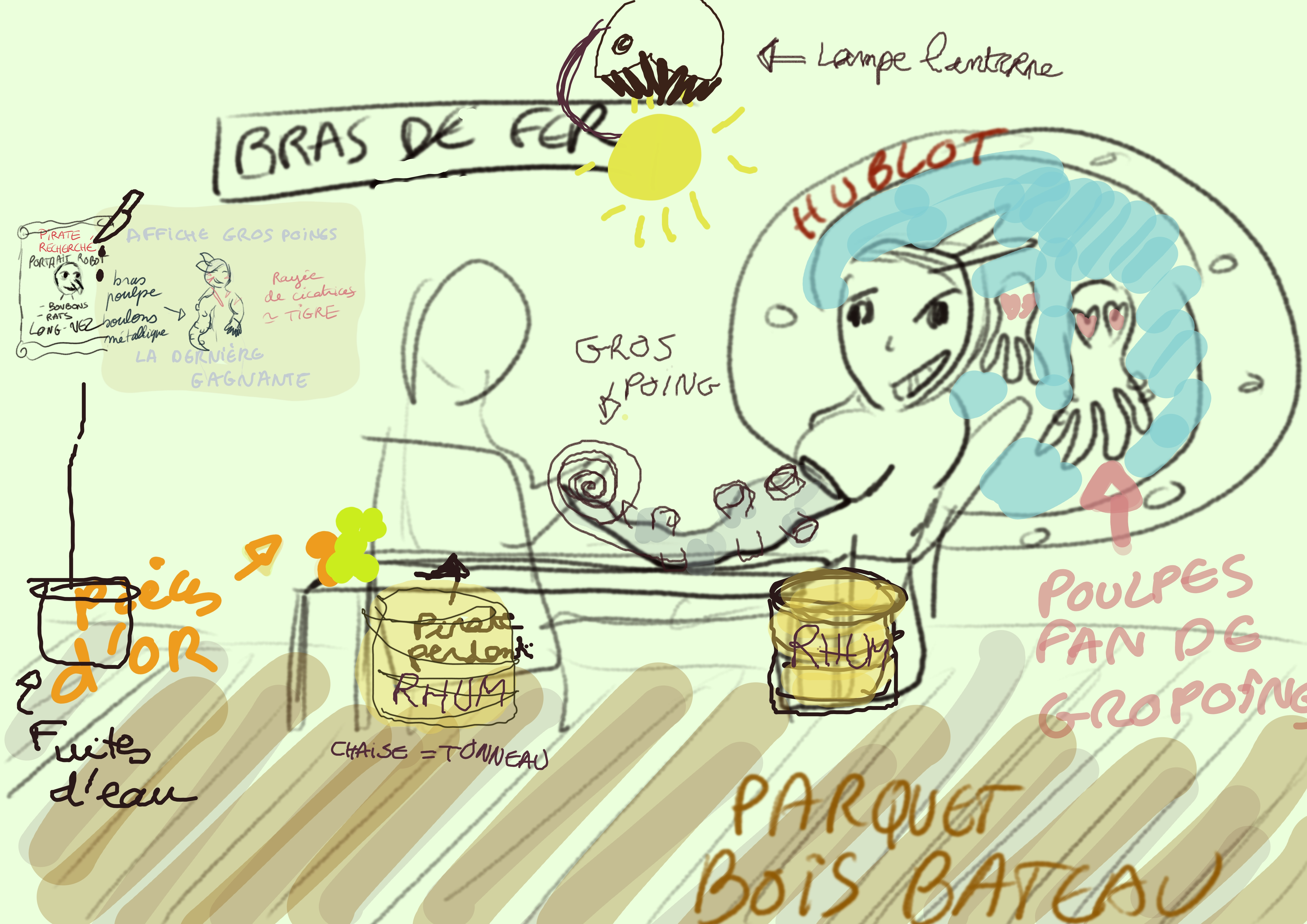 Bonsoir tout le monde ! C'est mon premier challenge et j'ai plein d'idées mais pas encore de maitrise ^^ Je viens de commencer les cours sur DPS et je pense que je vais bien m'amuser ! Gropoing fait du bras de fer... avec son bras de fer ! Voilà l'idée de départ, et comme c'est une prothèse originale, j'ai pensé à un bras métallique en forme de tentacule de poulpe où les ventouses seraient des boulons ^^ et comme elle a un bras poulpe, plein de poules viennent la soutenir pour son match héhé !