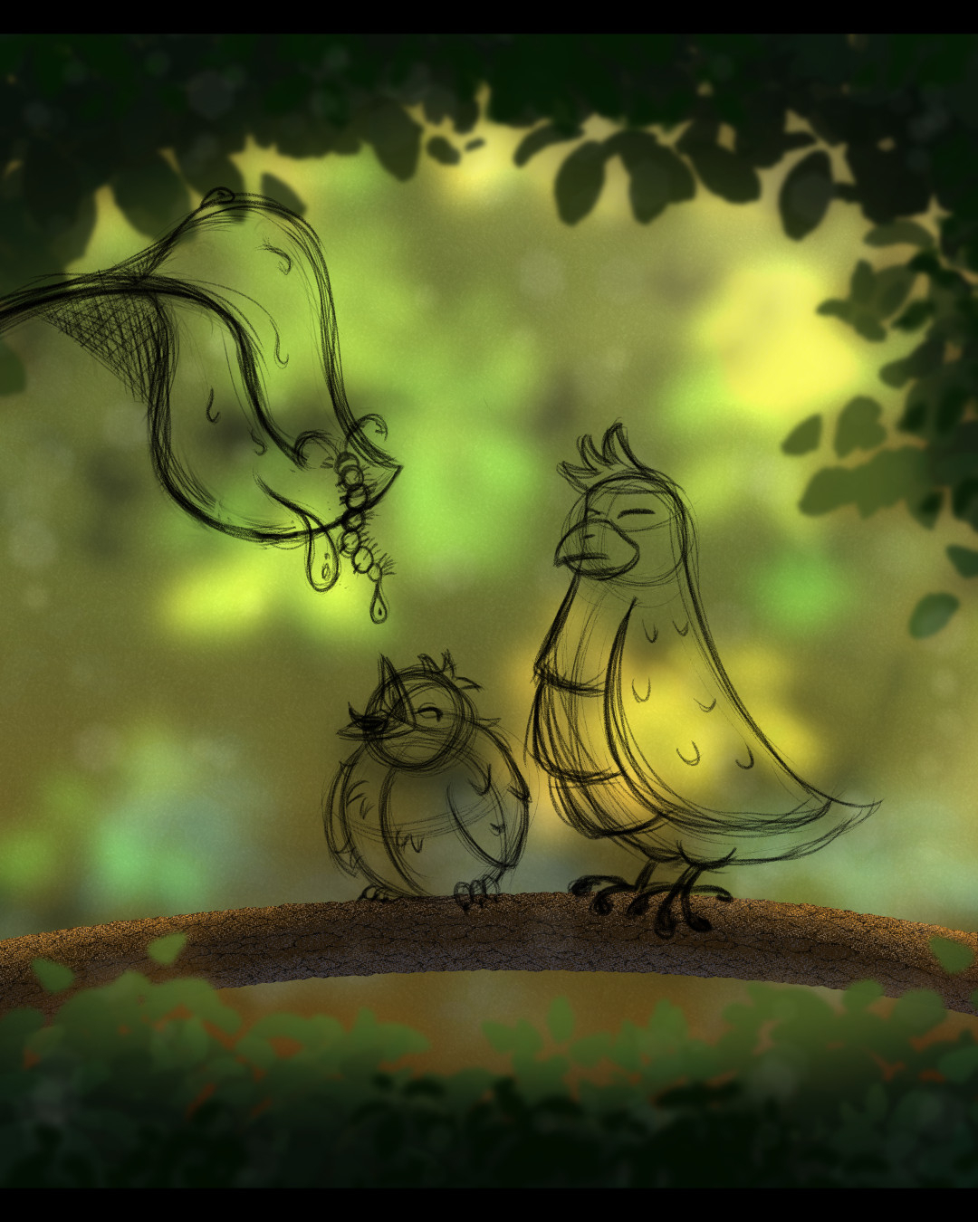 hello, En attendant j'ai avancé sur le croquis des oisillons. j'ai mis la couleur déjà cela permet de mieux voir le croquis.