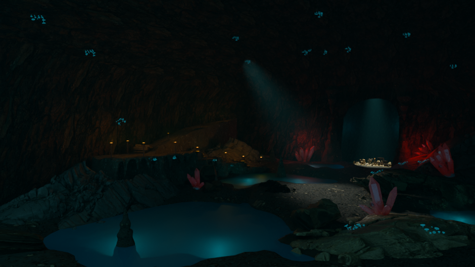 Allez une première version de l'aménagement de la grotte et un test de lumière : Je vais rajouter encore les coffres barils et autres éléments issues de butins pirates ensuite je penses que passerais rapidement en Paint over car ma machine ne va pas tenir 🙂 -