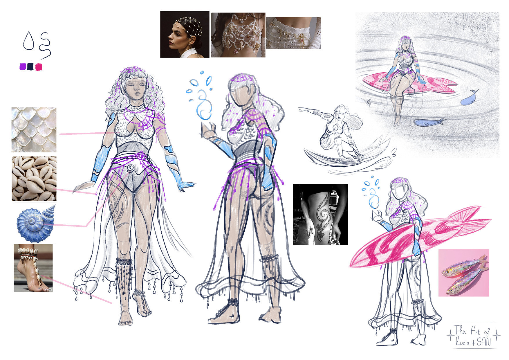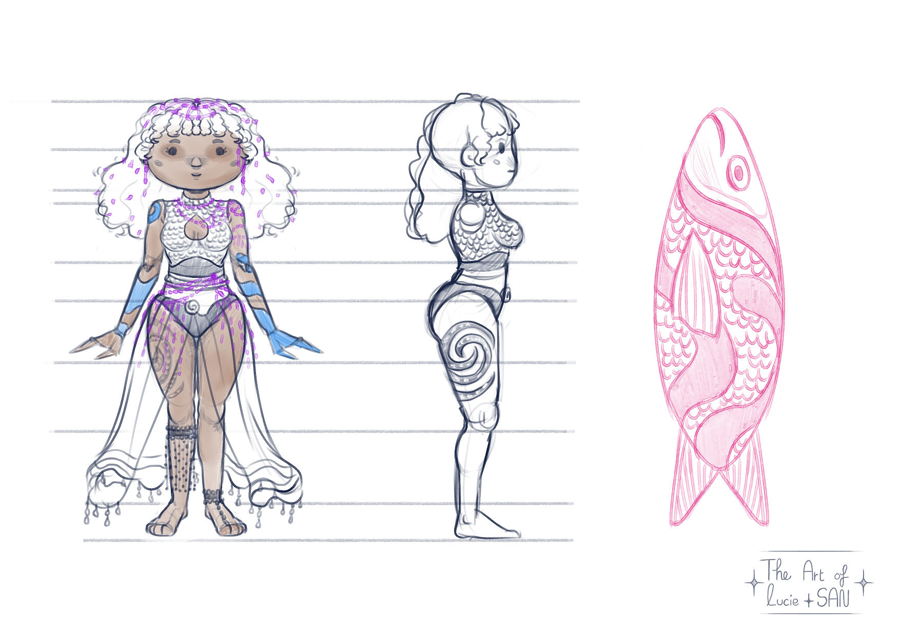 Hello, merci pour ce défi ! Voici ma participation :) Difficulté niveau 1 & 2 pour ma part :) J'avais dans l'idée de créer un personnage assez joyeux, doux, avec des vibes de la Polynésie. Comme elle est fun par nature, elle adore se balader avec sa planche de surf custom, et peut se déplacer sur la terre ferme avec, grâce à la magie de l'eau 🌊 J'ai essayé d'utiliser des formes rondes, en vague ou qui rappellent des gouttes. Ses bijoux sont en coquillages, et je voulais qu'ils rappellent la pluie, tout en apportant un peu de féminité et d'élégance :) J'ai aussi fait une variante plus cartoon :D -