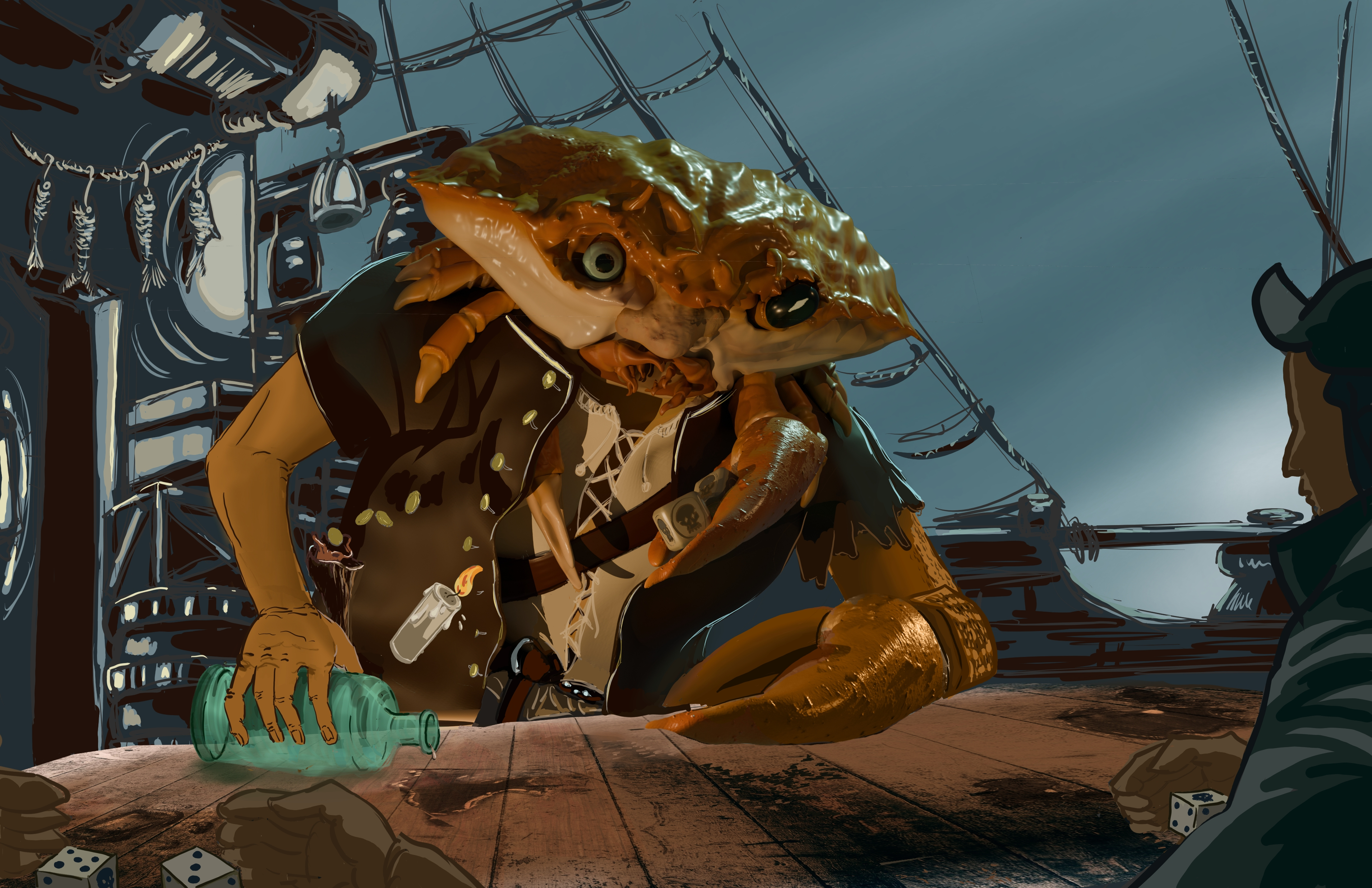 le singe on ne sait pas trop s'il est accroché à la corde ou au mat . Et c'est vrai que c'est dommage de ne pas voir sa main gauche. Par contre la dynamique est bonne !
