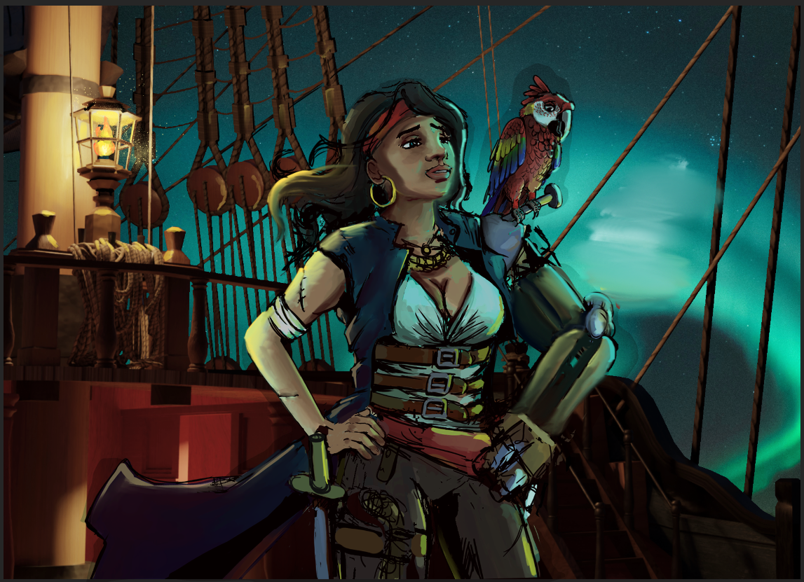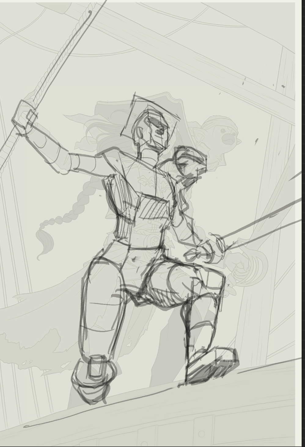 Merci beaucoup pour ta suggestion @Helgen. Elle faisait sens au moment ou je la lisais. Mais après avoir fait quelques recherches, je me suis finalement abstenue car avant tout, un pirate ne doit pas trop se charger avant une bataille, tout simplement. Sinon, c'est compliqué ^^ Voici le sketch au propre. Je passe après à la couleur finale. -
