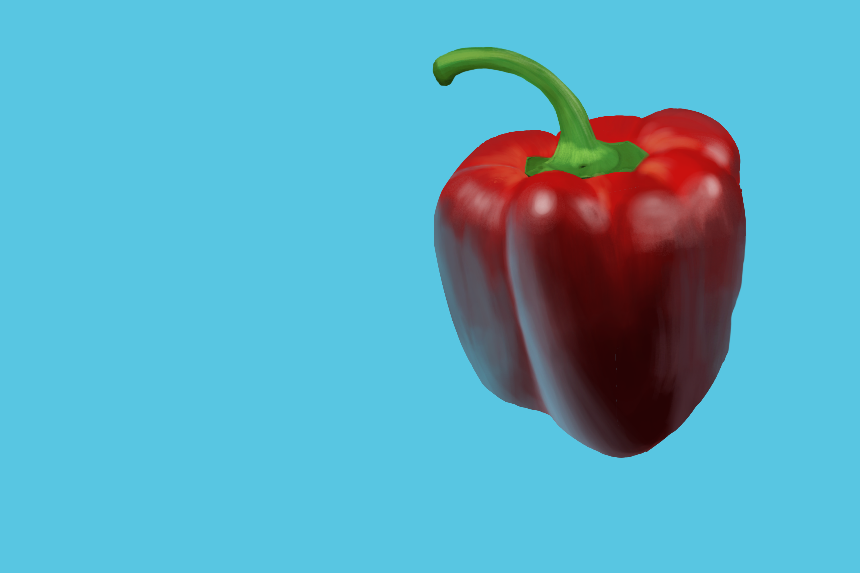 Bonsoir les gens. Voici mon essaie pour l'exercice 4 avec le poivron, j'ai essayé de me passer du croquis et des couleur pour le faire, j'ai juste vérifié le croquis une fois pour vérifier les proportions de la silhouette que j'ai corrigé ensuite sans recopier le croquis. j'ai également repris la même couleur de fond bleu présent dans le photoshop mais j'ai par la suite essayer de trouver moi même les couleurs adéquate pour le poivron et je crois ne pas m'en être trop mal sorti. J'ai surtout été surpris par la qualité du résultat que j'ai réussit a atteindre au bout d' 1 heure, je m'attendais à ce que cela me prenne plus de temps que prévu ce qui me réjouit, je crois que je m'améliore vraiment (Quoique très lentement). -