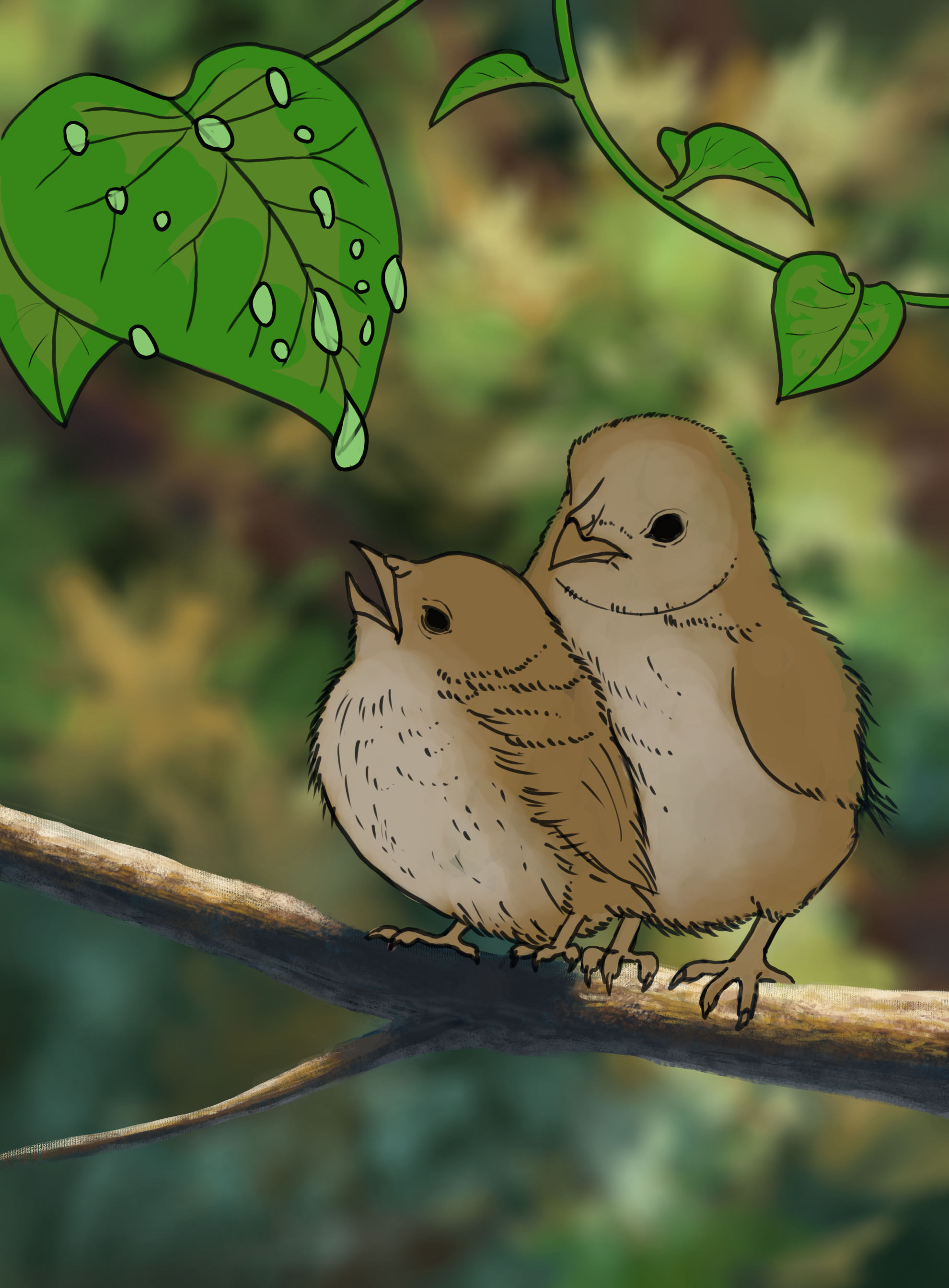 Bonjour ! J'ai terminé l'étape du croquis des oisillons, la voici. J'ai rajouté un peu de saturation à la limite entre l'ombre et la lumière sur la branche comme cela m'a été conseillé. - Aujourd'hui