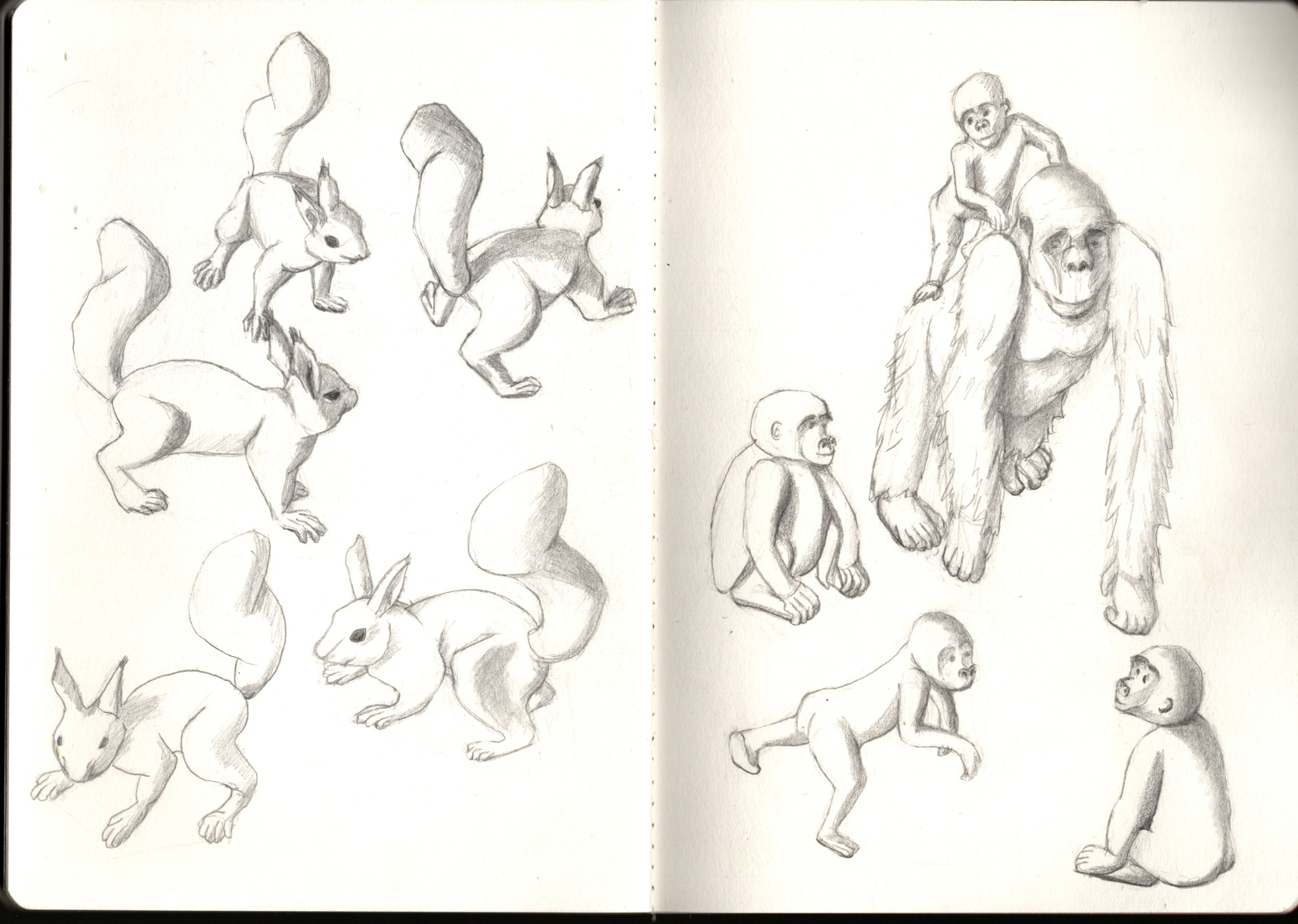 Oups, je suis en retard ! Voici pour la première semaine, des mammifères. J'ai dessiné à partir de mes petites figurines d'écureuil et de gorilles en tentant de les représenter sous différents angles.