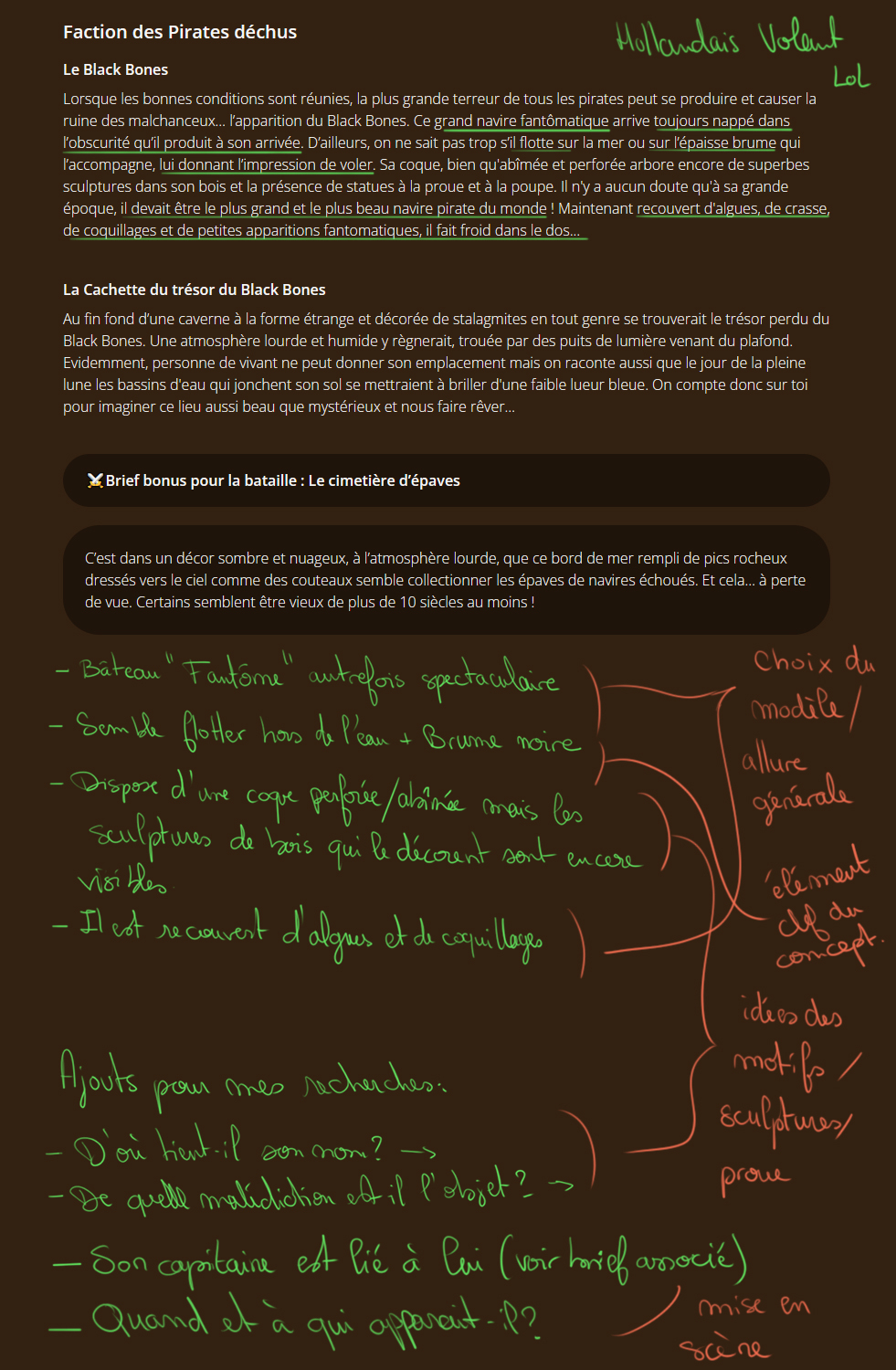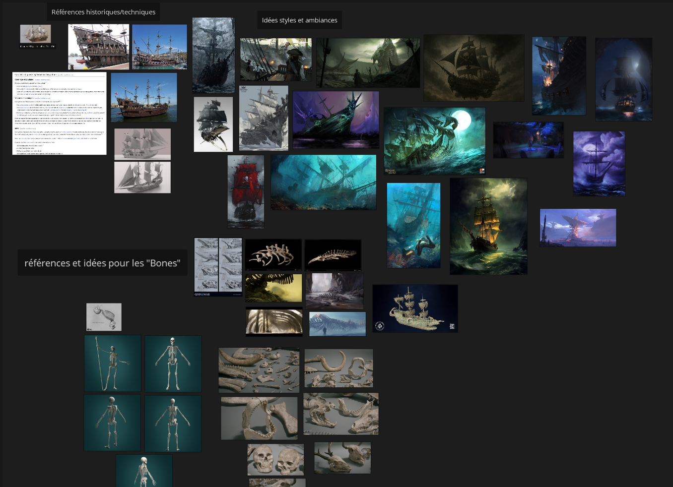 Allez, c'est parti pour un nouveau challenge ! Même si j'étais pas serein sur ma capacité à tenir le délais, ça me tente assez de tenter de me surpasser pour quelque chose que je connais vraiment peu : la piraterie ! ☠️Je n'y connais franchement pas grand chose, en dehors des poncifs du genre, donc la curiosité me pique. Et comme j'aime bien le mythe du Hollandais Volant, eh bah je vais partir sur la proposition de brief du "Black Bones" pour les Pirates déchus. Que l'esprit de Jack Sparrow soit avec moi pour ce que je m'apprête à imaginer : le légendaire navire fantôme "Black Bones", dont l’apparition sinistre est un présage dont tout pirate se passerait volontiers... Mais que se passe-t-il lorsque sa silhouette funeste vous surplombe soudain au sortir d'une tempête ? Mh ? Mystère... Comme il s'agit d'un concept art, je pense creuser bien davantage ma proposition au niveau de sa conception/de son background que juste paufiner mon image de rendu : j'espère que ce WIP pourra permettre aux curieux qui le veulent de suivre mes tribulations mentales à loisir. Petit travail préliminaire sur le brief choisi : Je vais donc décortiquer ma recherche sur ces trois axes : modèle du navire et allure générale / les "détails" de son design qui se concentrent sur les sculptures et décors de sa coque et sa proue / les éléments obligatoires faisant partie du design comme la brume noire et les apparitions fantomatiques. Premier extrait de ma récoltes de références et d'images pour mon travail : To be continued ✨