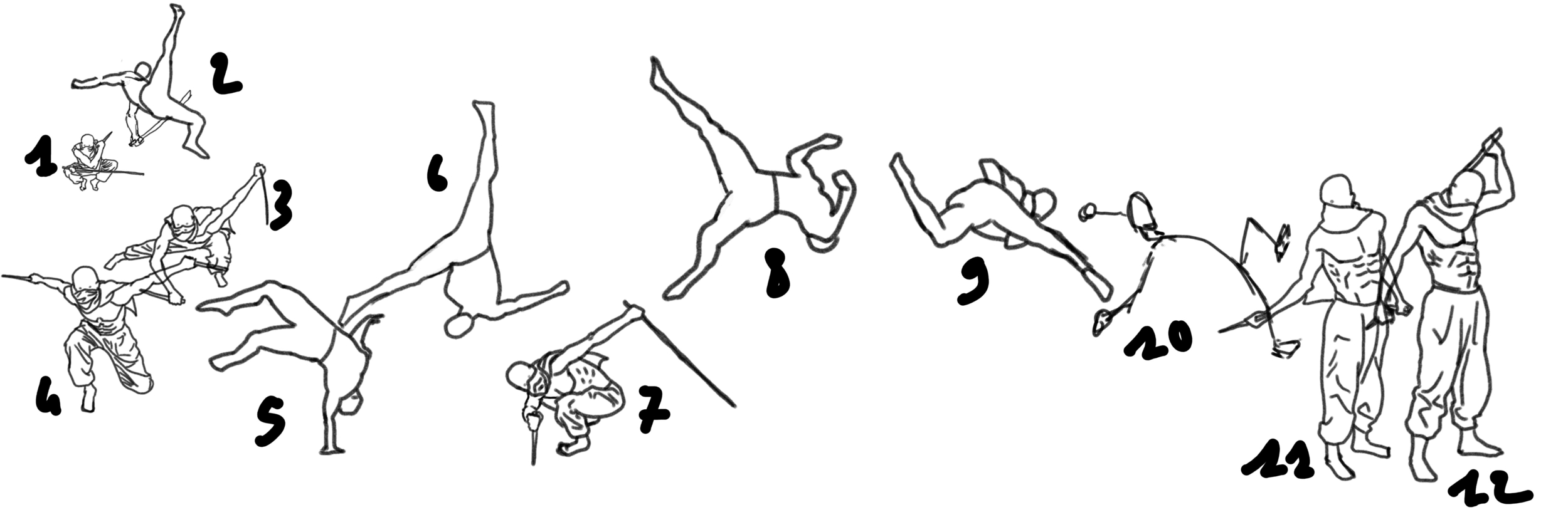 Et hop, voilà une première version du "chemin" qu'emprunterait mon Hayabusa ! Double challenge : Avoir une progression suffisamment claire Faire coller un décor de bataille avec des ennemis terrassés un peu partout Dans l'idée, voilà la scène décrite avec des mots : Départ accroupi depuis son bateau Saut type salto avant pour combler la distance avec le bateau ennemi + jet de kunai (il aura une ceinture de kunai autour du torse) Atterrissage sur le pont du bateau ennemi Charge vers l'avant en double taillade des adversaires environnants Flip arrière sur une main, transitionne vers Pseudo roue sans les mains + jet de kunai Atterrissage accroupi Saut type salto arrière + jet de kunai Transition aérienne Atterrissage en double taillade des adversaires environnants Secoue son sabre pour le débarrasser du sang Rengaine 😎 Qu'en dites-vous ?