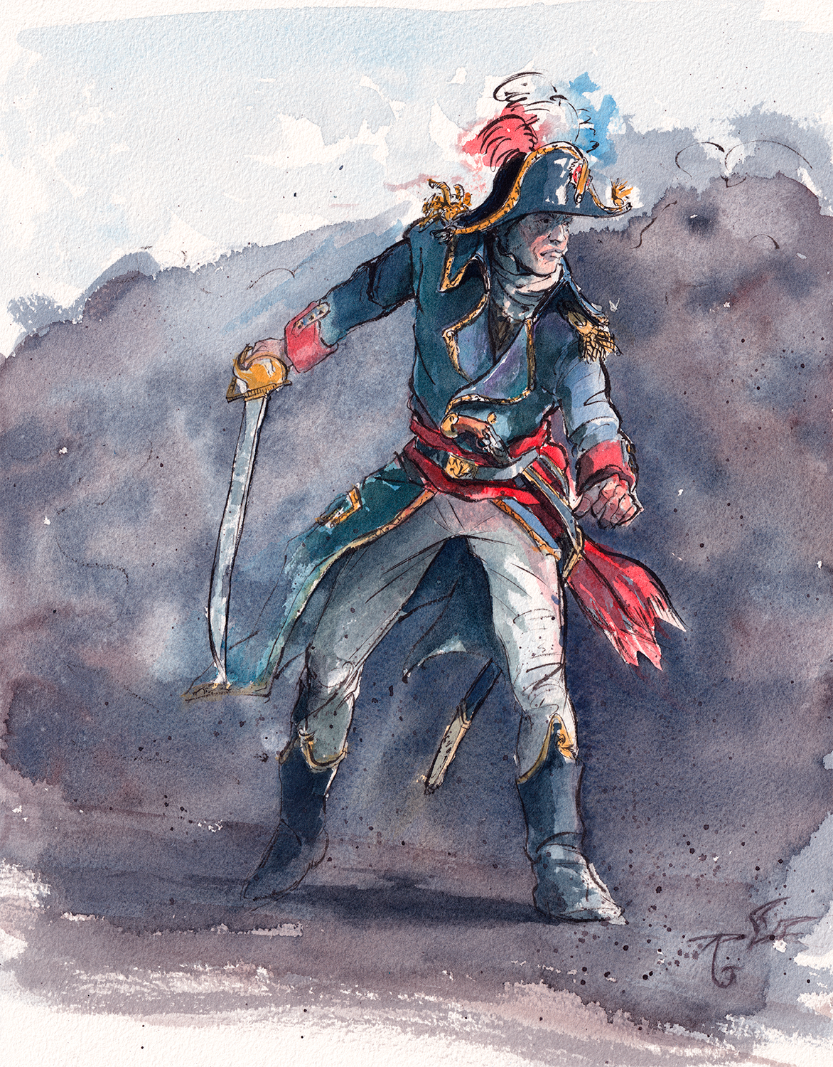 Voilà pour l'étude de Katryna. Mais comme je le disais plus haut, j'avais envie de me faire plaisir en incorporant 3 personnages dans une cabine de poupe navire 17ème taille frégate. Rien que ça 😅. Comme j'ai un style plutôt réaliste, pas de Gropoings et le Capitaine n'aura pas de bouclier ni de fleuret. Ce dernier étant malcommode à bord et remplacé par un sabre. L'épée étant réservée lors des cérémonies ou autres rdv à terre. Je viens de sceller mon sort, je suis hors sujet des briefs. Mais la tentation et le bonheur de participer l'emportent. Alors je continue. D'abord il me faut un capitaine. J'ai choisi un capitaine des années 1790 car à cette période, il y avait un flou dans les uniformes et certains officiers avaient un panache sur le bicorne. Alors banco. Après des recherches biblio, je réalise ce croquis. -